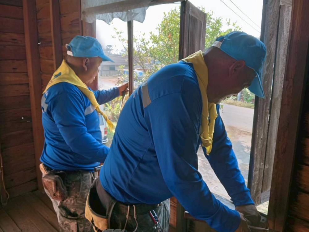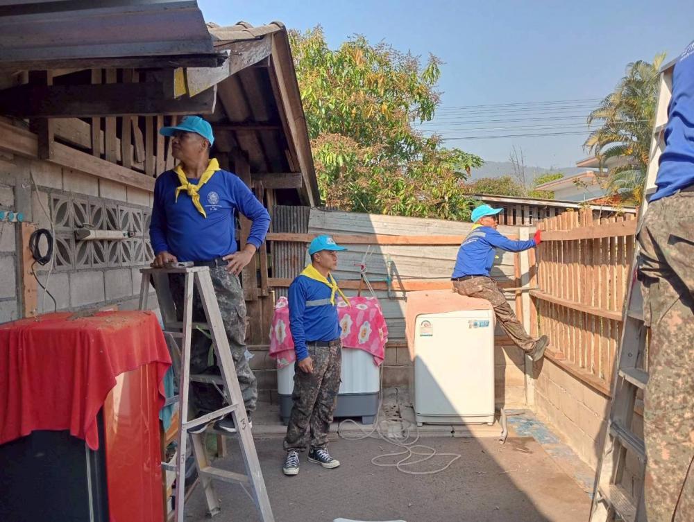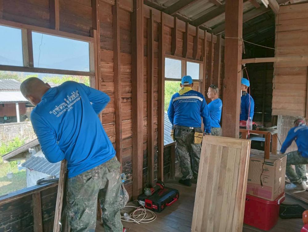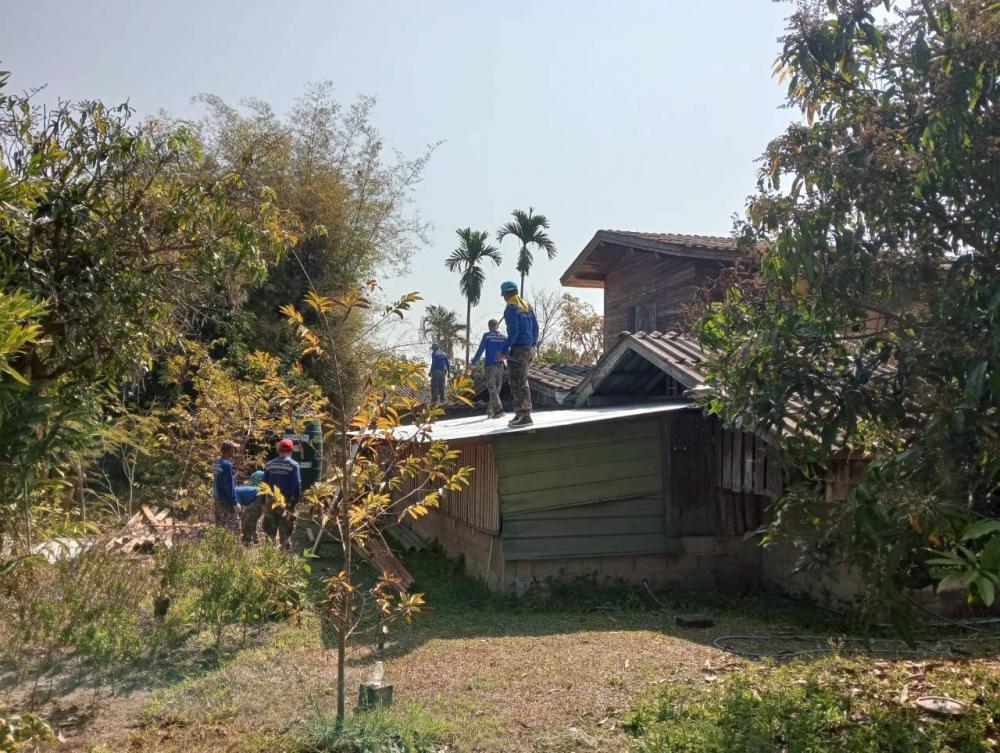 มอบหมายให้ รศ.ดร.นาวินพรมใจสา รองอธิการบดีฯจิตอาสา4A-393/ก จิตอาสา 904 ผอ.ศูนย์เฝ้าระวังและตอบโต้ภัยพิบัติเพื่อนพึ่ง(ภาฯ)ราชภัฏเชียงราย พร้อมด้วย อ.สุรเดช ต่างเพชร ผู้ช่วยอธิการบดีฯและ ผอ.ราชันย์ ทนันชัย ผอ.กองบริหารกายภาพสิ่งแวดล้อมและความปลอดภัย ผู้ควบคุมการก่อสร้างฯ นำกำลังพลจิตอาสาฯสังกัดมหาวิทยาลัยราชภัฏเชียงรายลงพื้นที่ปรับปรุงซ่อมแซมบ้านให้กับ นาง จันทร์พลอย นันตา อายุ 65 ปีครอบครัวมีสมาชิกจำนวน 5 คนประกอบด้วย ผู้สูงวัย เยาวชนฯประกอบอาชีพได้มีเพียงคนเดียว บ้านหลังดังกล่าวเป็นบ้านไม้โบราญ ชั้นล่างก่ออิฐพื้นปูน ก่อสร้างมาแล้วมากกว่า 50 ปีจึงทำให้ตัวบ้านชั้นบนผุพังตามกาลเวลา มีน้ำซึมรั่วอย่างมากในเวลาฝนตก อาศัยอยู่ด้วยความลำบากในการดำเนินชีวิต