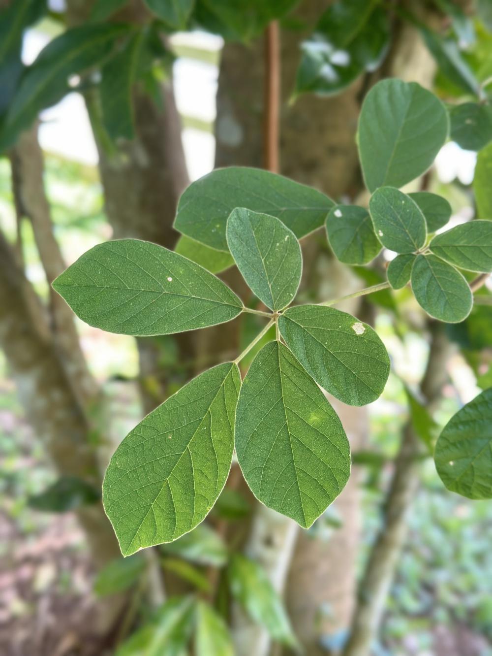 ปนเทา เรือนยอดเป็นพุ่มกลมใหญ่ ใบเนียง เป็นช่อแบบขนนก 2 ชั้นแตกแขนงตรงข้ามกัน แต่ละช่อมีใบย่อย 2-4 คู่ใบย่อยปลายใบเรียวแหลมฐานใบมนและเบี้ยวเล็กน้อย หลังใบเกลี้ยงยอดอ่อนมีสีแดง ดอกเนียง เป็นช่อกลมเล็กมี 3-6ดอก ดอกสีขาวขนาดเล็ก กลีบดอกมี 5 กลีบขนาดเล็กมาก โคนดอกติดกันเป็นหลอดยาว 2ซม. ผลเนียง เป็นฝักแบนเป็นเกลียวไปทางเดียว