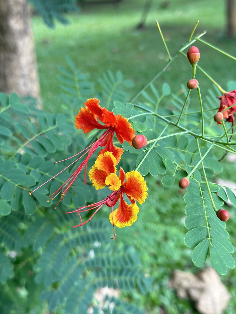 ไม้พุ่มเตี้ยชนิดหนึ่ง สูง 3-5 เมตร ทรงพุ่มกลม ต้นเกลี้ยงหรือมีหนาม ใบ ประกอบแบบขนนกสองชั้น ออกสลับ ช่อใบย่อยมีใบย่อย 7-11 คู่ รูปขอบขนาน หรือรูปไข่กลับ ปลายมนหรือเว้า โคนเบี้ยว ดอก มีหลายสีตามพันธุ์ ได้แก่ เหลือง แดง ส้ม ชมพูแก่ แดงประขาว ดอกเป็นช่อ ตามซอกใบและปลายกิ่ง กลีบดอก 5 กลีบ ขนาดไม่เท่ากัน เกสรตัวผู้ 10 อัน ออกดอกตลอดปี ผล เป็นฝักแบน เมื่อแก่แตกได้ ออกฝักตลอดปี เมล็ด 8-10 เมล็ด เมล็ดมีรูปร่างกลม