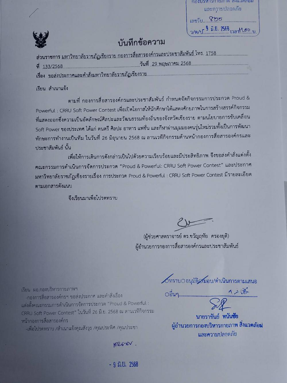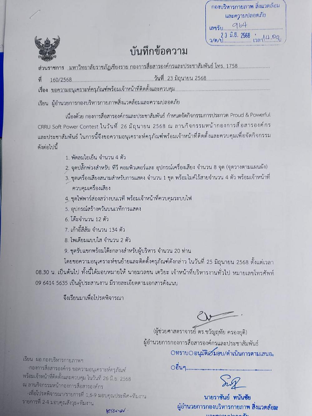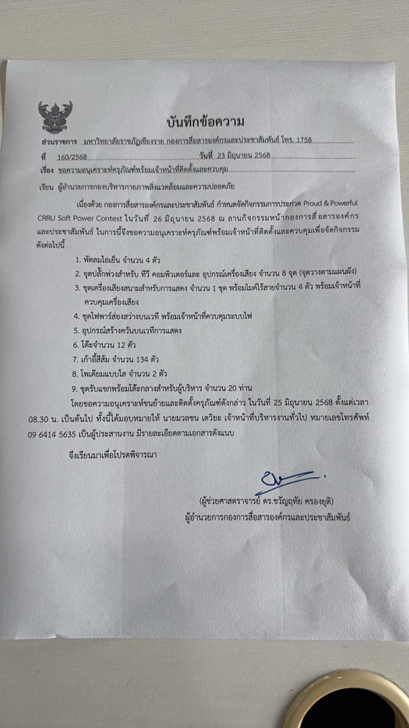 กองการสื่อสารฯ จัดสถานที่กิจกรรม "Proud & Powerful: CRRU Soft Power Contest" วันที่ 26 มิ.ย. 2568 ณ ลานเวทีกิจกรรมด้านหน้ากองการสื่อสารองค์กรและประชาสัมพันธ์
