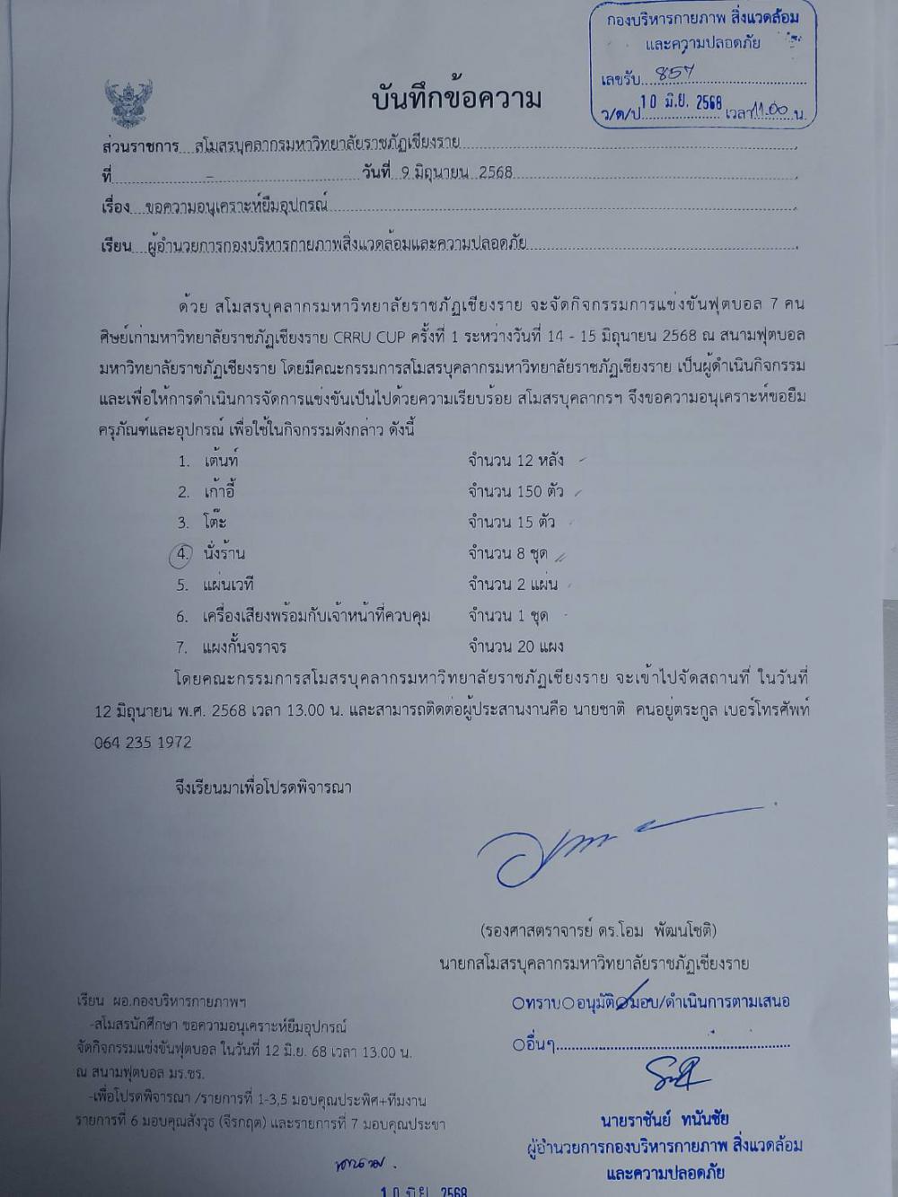 ส่วนกลาง มหาวิทยาลัย ขนย้ายอุปกรณ์ ไปที่สนามกีฬากลางมหาวิทยาลัย กิจกรรมการแข่งขันฟุตบอล 7 คน ศิษย์เก่ามหาวิทยาลัยราชภัฏเชียงราย CRRU CUP ครั้งที่ 1 วันที่ 14-15 มิ.ย. 2568 อุปกรณ์ดังนี้ 1. เต้นท์ 12 หลัง 2. เก้าอี้ 150 ตัว 3.โต๊ะ 15 ตัว 4. นั่งร้าน 8 ชุด 5.แผ่นเวที