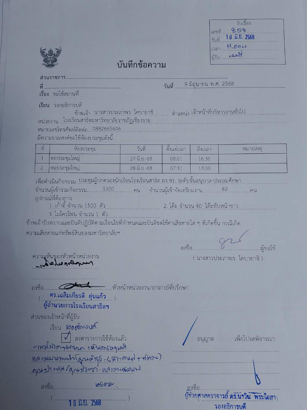 ประเภทงาน: จัดสถานที่ ผู้ประสาน: ประภาพร 0882665646 รับแจ้ง: 11 มิถุนายน 2568