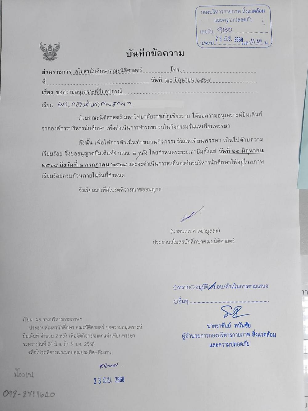คณะนิติศาสตร์ ขนย้ายเต้นท์บริการ นศ. ทำรถขบวนแห่เทียน จำนวน 2 หลัง ตั้งแต่วันที่ 24 มิ.ย. - 3 ก.ค. 2568