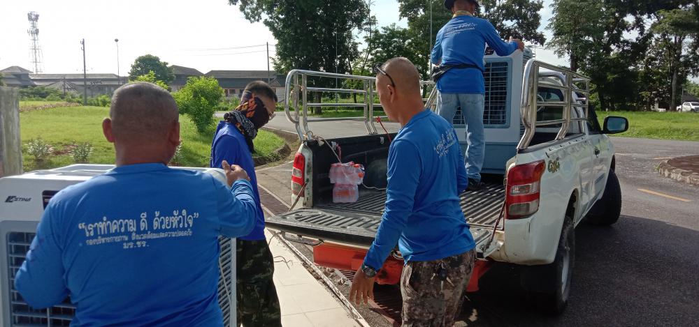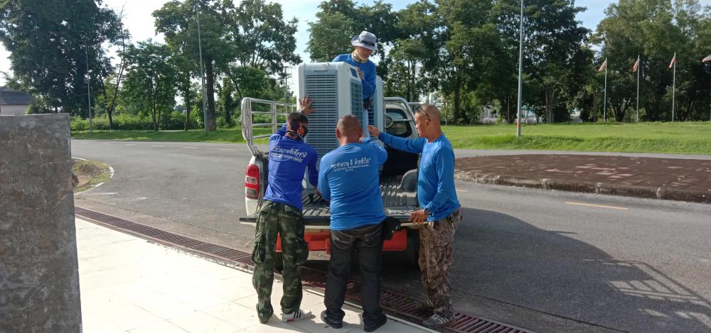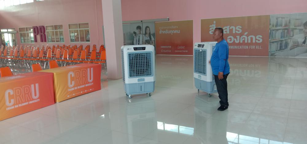 กองบริหารกายภาพฯ ขนพัดลมไอน้ำจากโรงอาหารไปด้านหน้าเวทีสำนักสื่อสารองค์กร