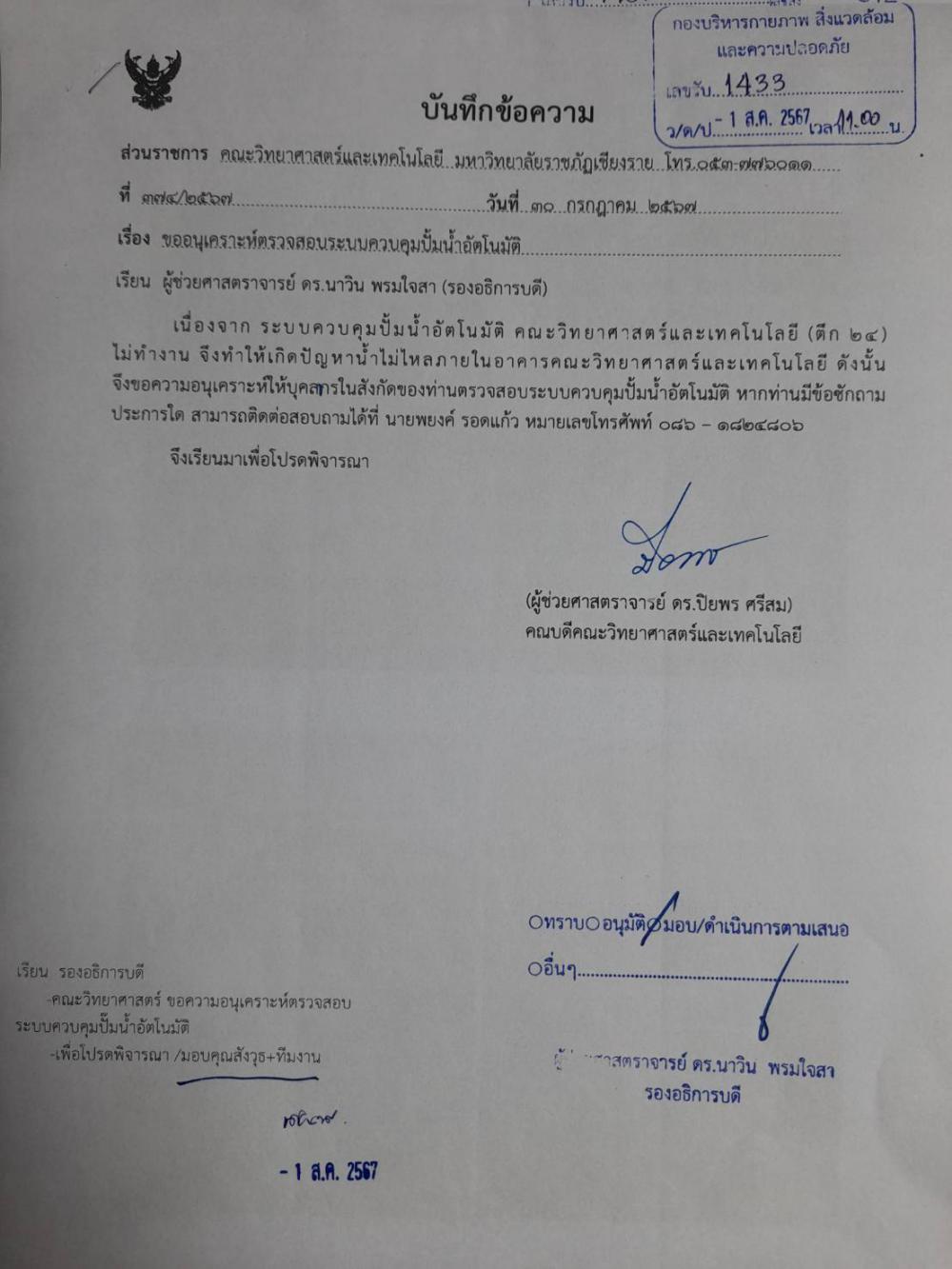 ขอความอนุเคราห์ตรวจสอบระบบควบคุมปั๊มน้ำอัตโนมัติ อาคารคณะวิทยาศาสตร์ฯ