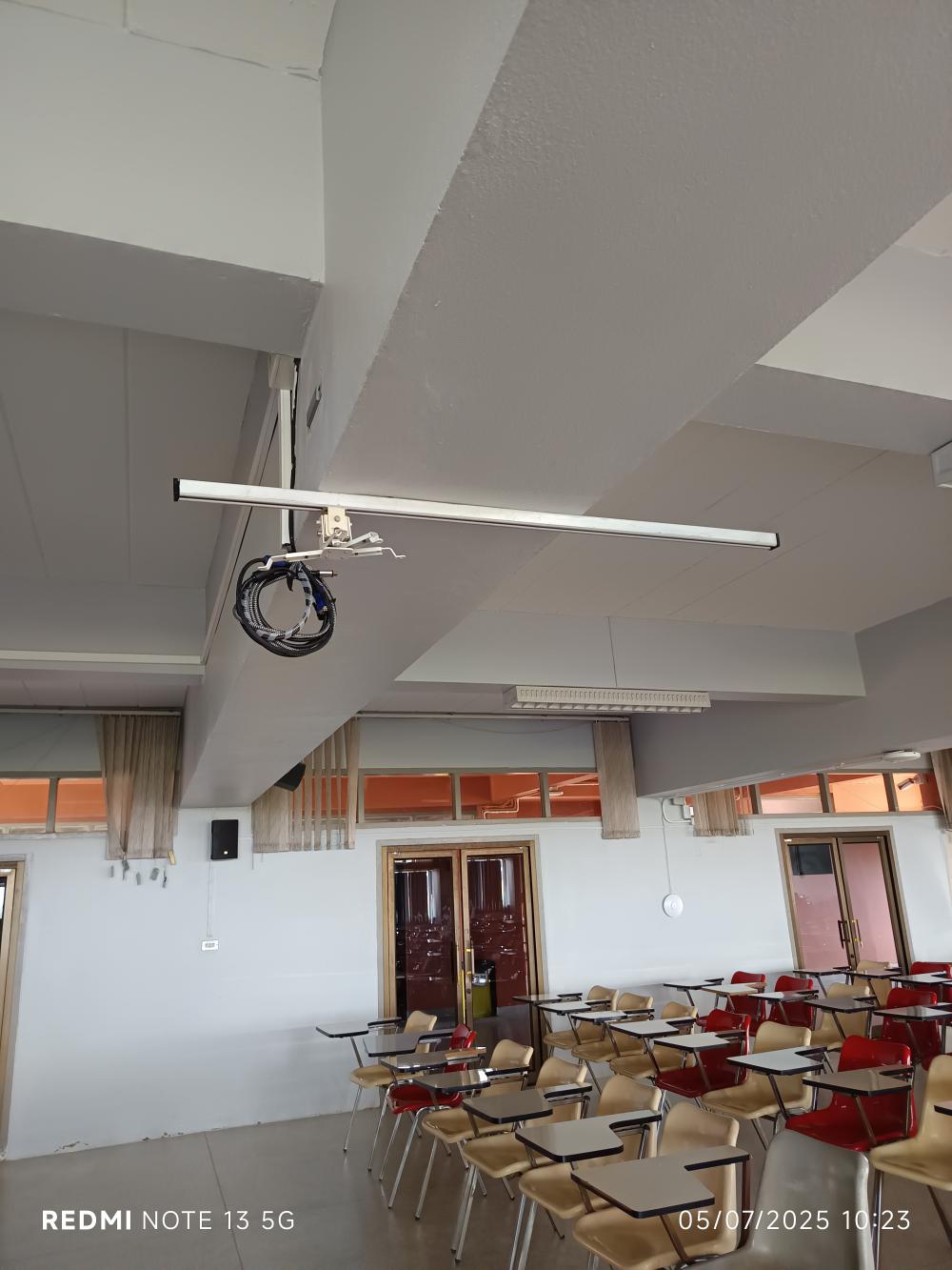 กองบริหารกายภาพฯ ตรวจสอบซ่อมเครื่องเสียงห้องเรียน 2632 ประตูหนีบสายไฟ ไฟซ้อต
