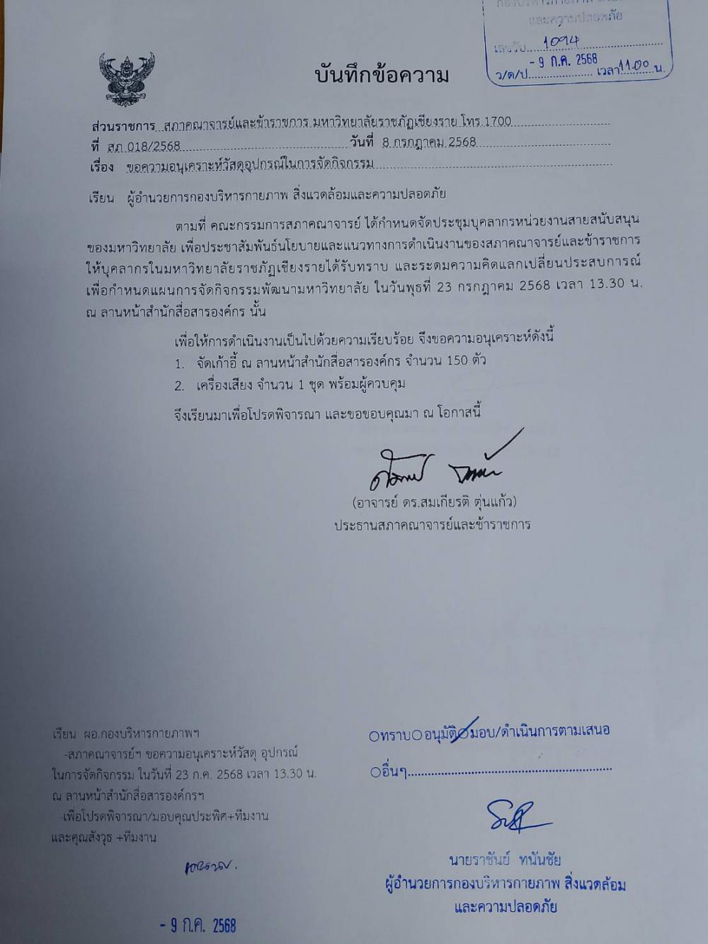 ประเภทงาน: จัดสถานที่ ผู้ประสาน: รับแจ้ง: 14 กรกฎาคม 2568