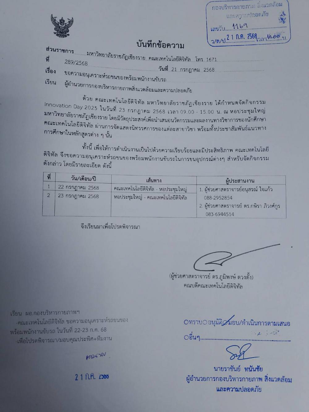 คณะเทคโนโลยีดิจิทัล ขนย้ายอุปกรณ์จากคณะเทคโนโลยีดิจิทัลไปหอประชุมใหญ่ ขอประสานงานกับเจ้าหน้าที่ของคณะเวลาขนย้ายด้วย วันที่ 22 ก.ค. 2568