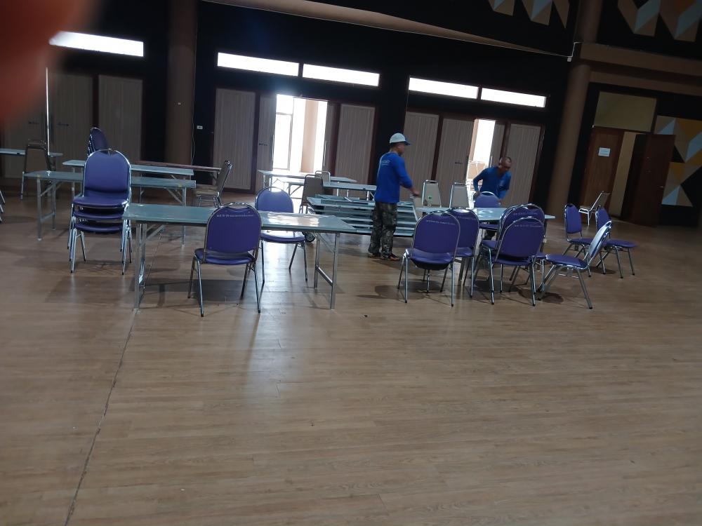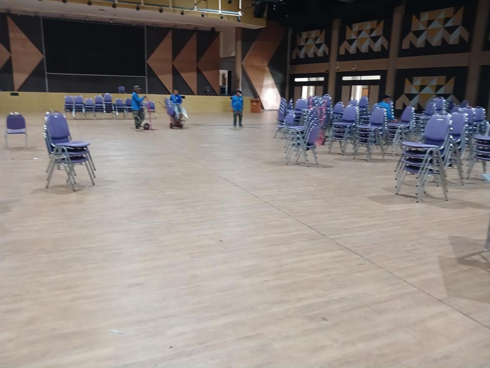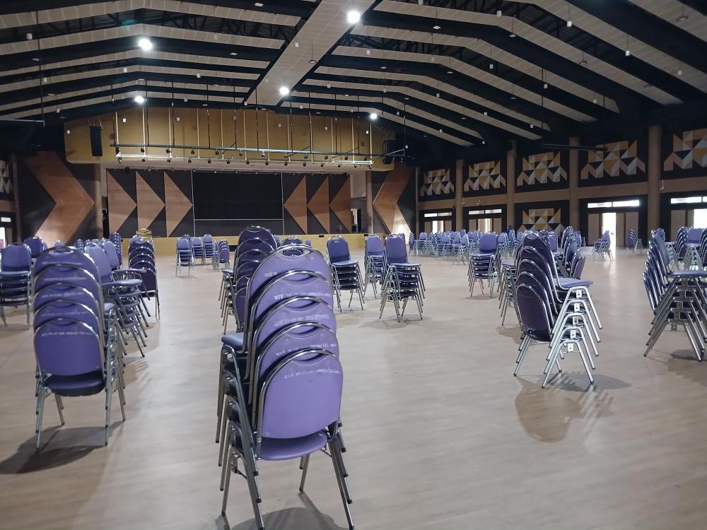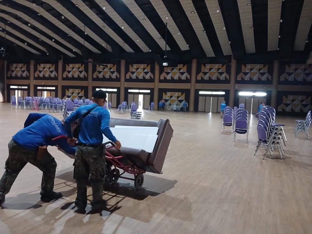 ขนเก้าอี้ในหอประชุมใหญ่