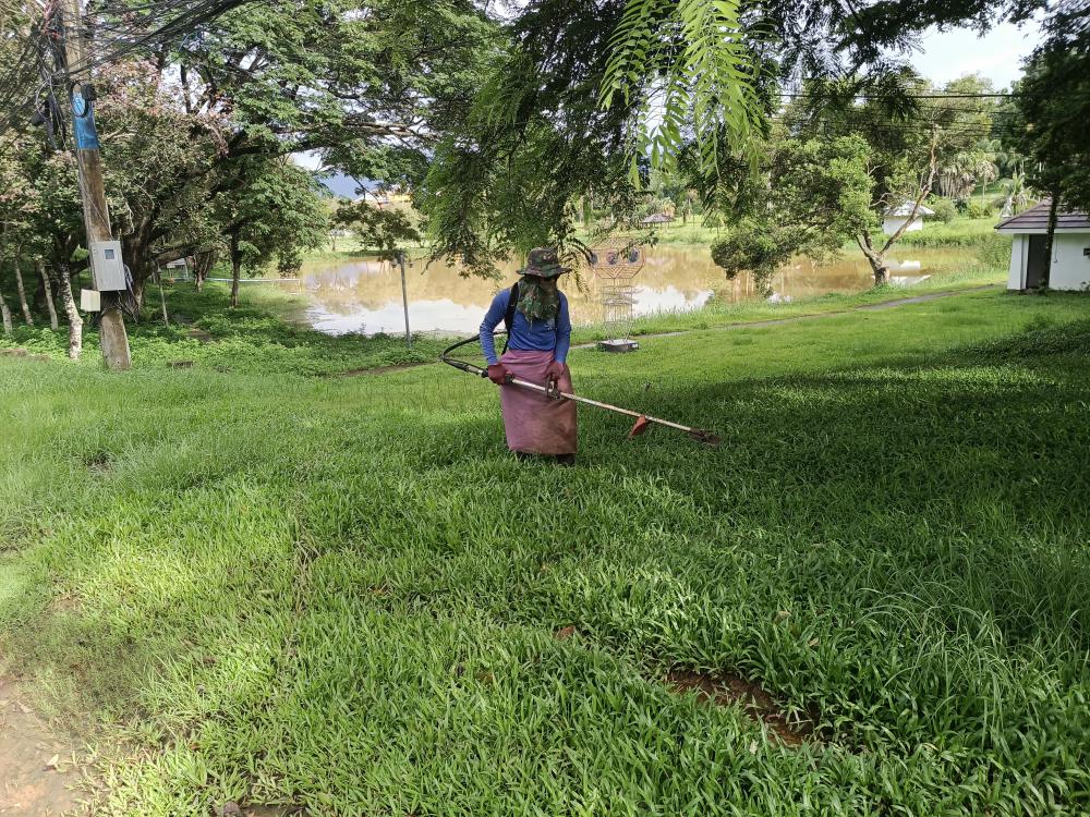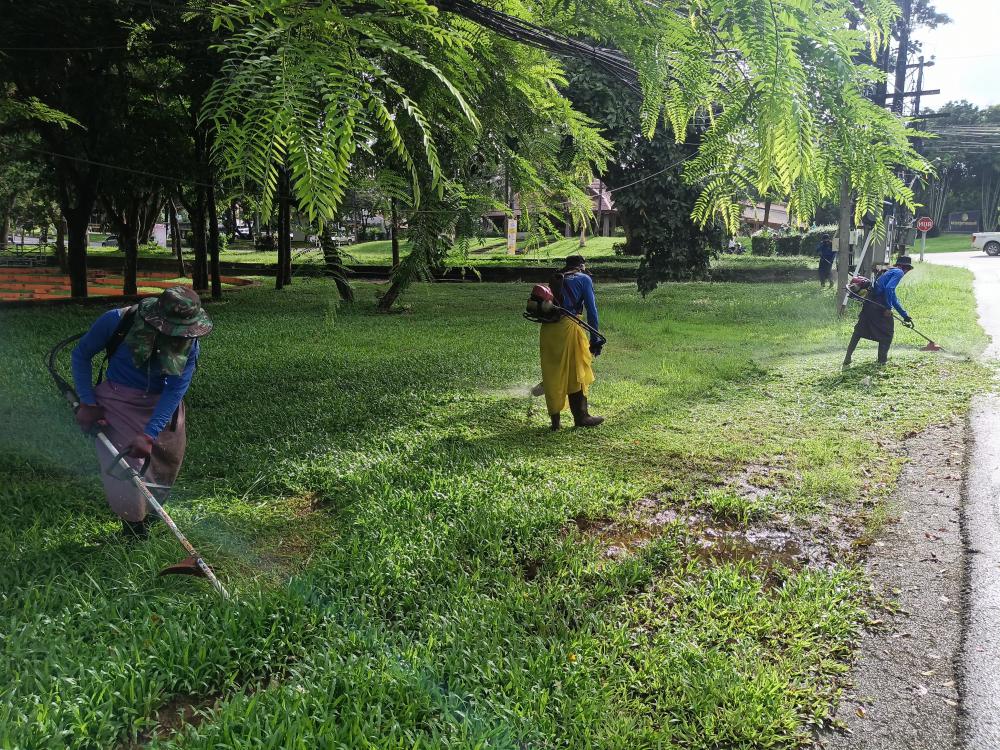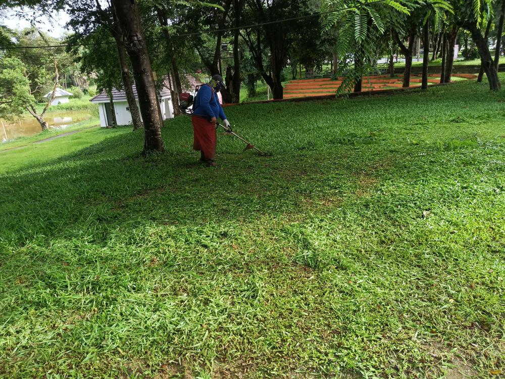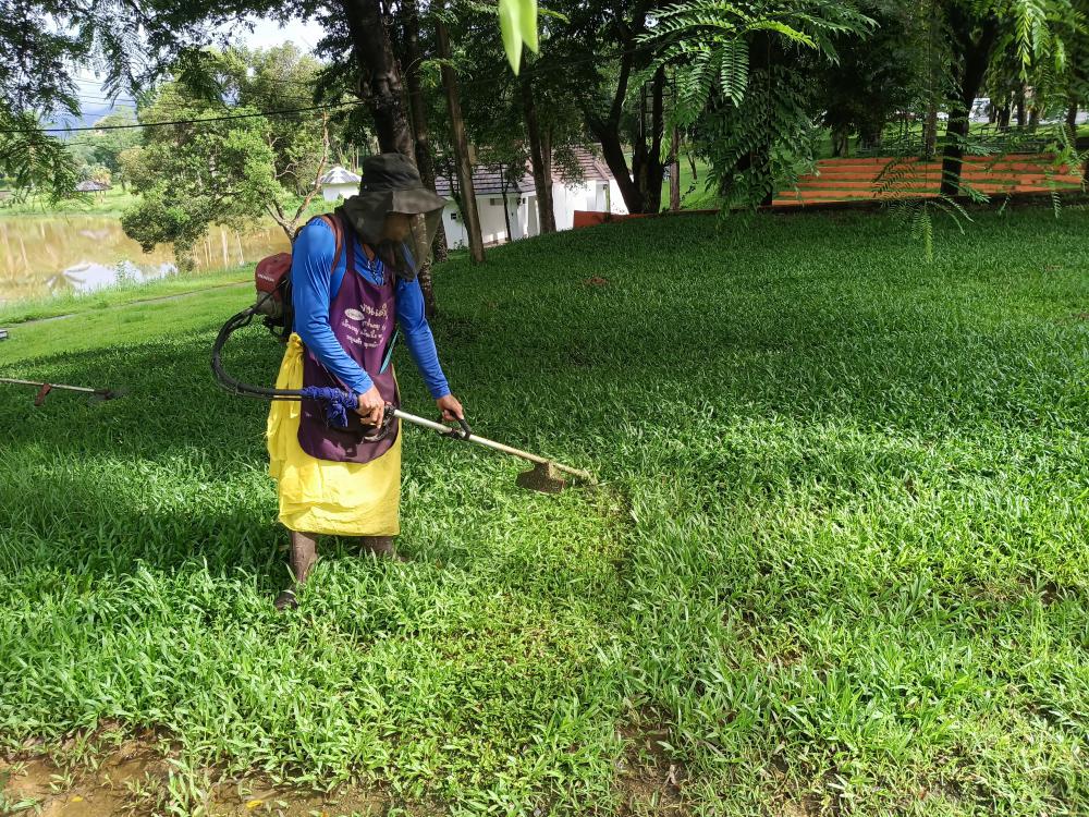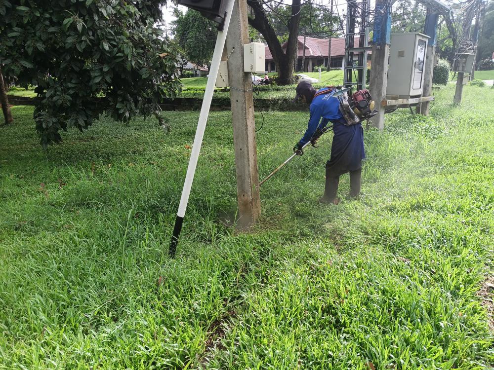 กองบริหารกายภาพฯ ตัดหญ้าหลังเวทีกลางแจ้ง