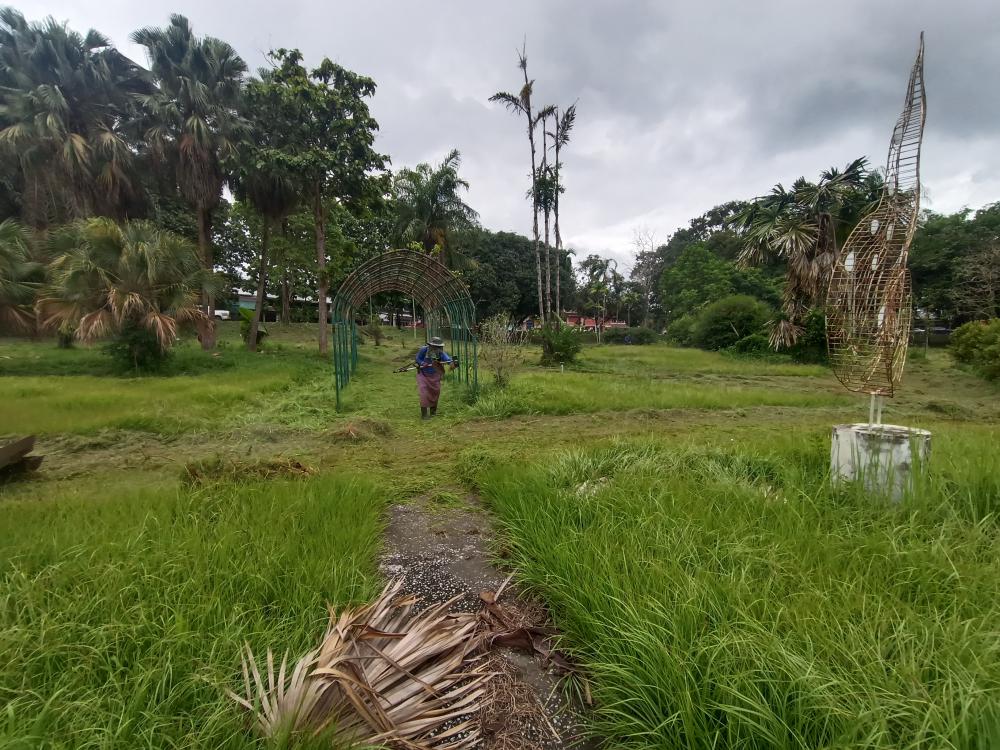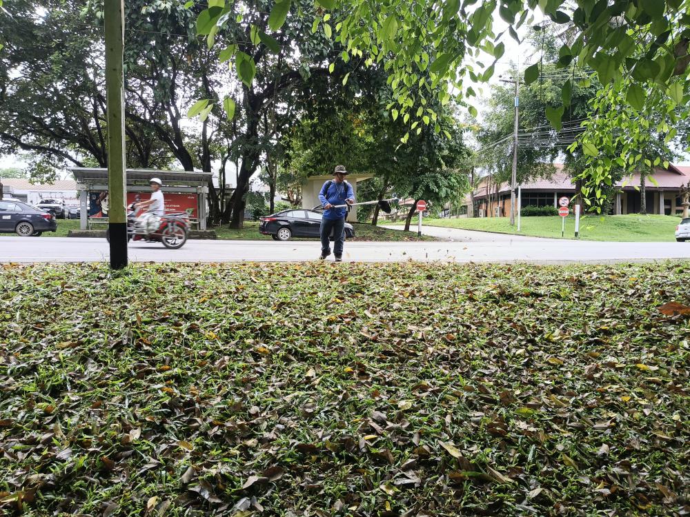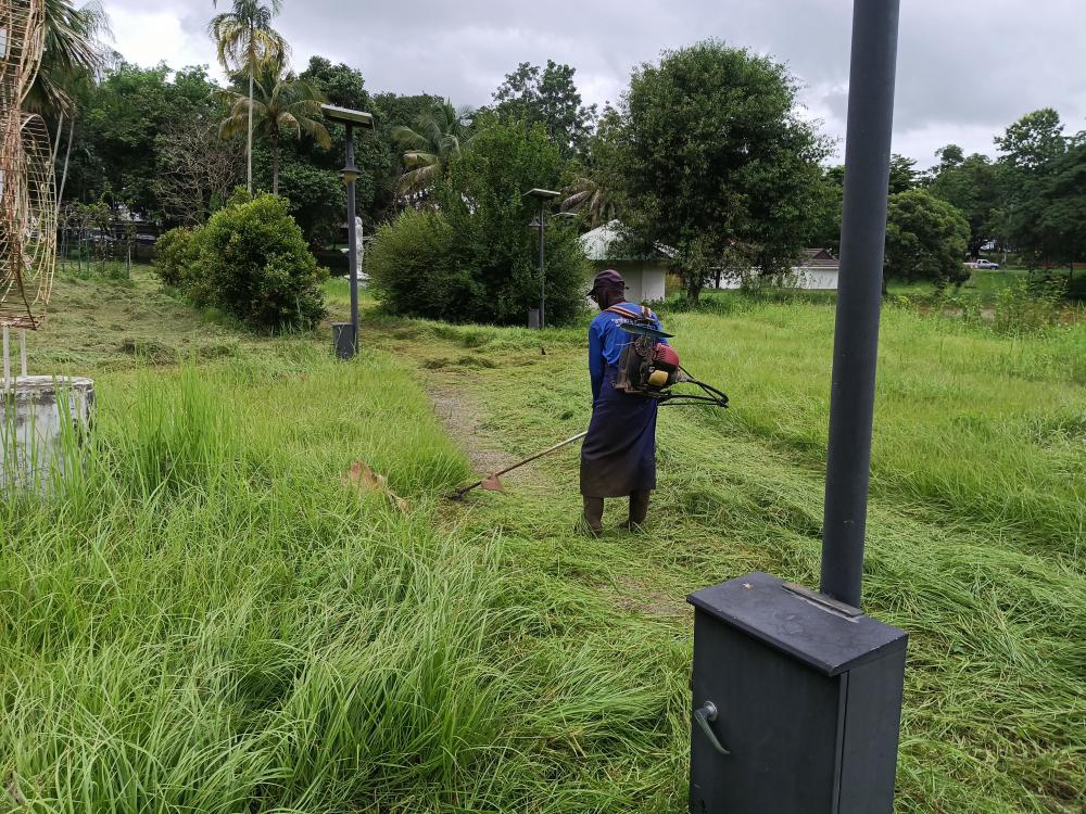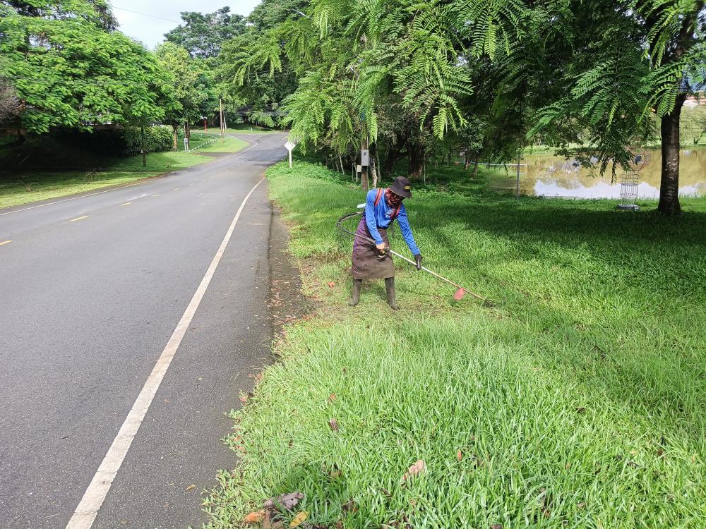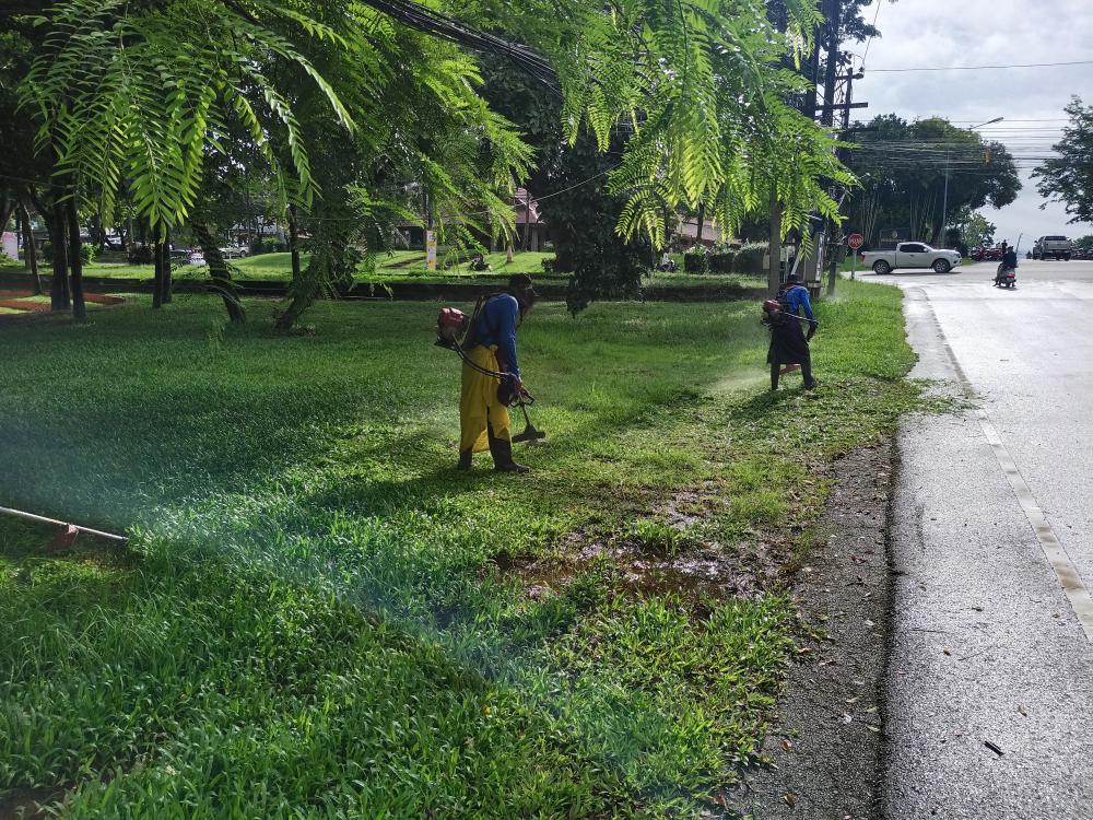 กองบริหารกายภาพฯ ตัดหญ้าหลังเวทีกลางแจ้ง