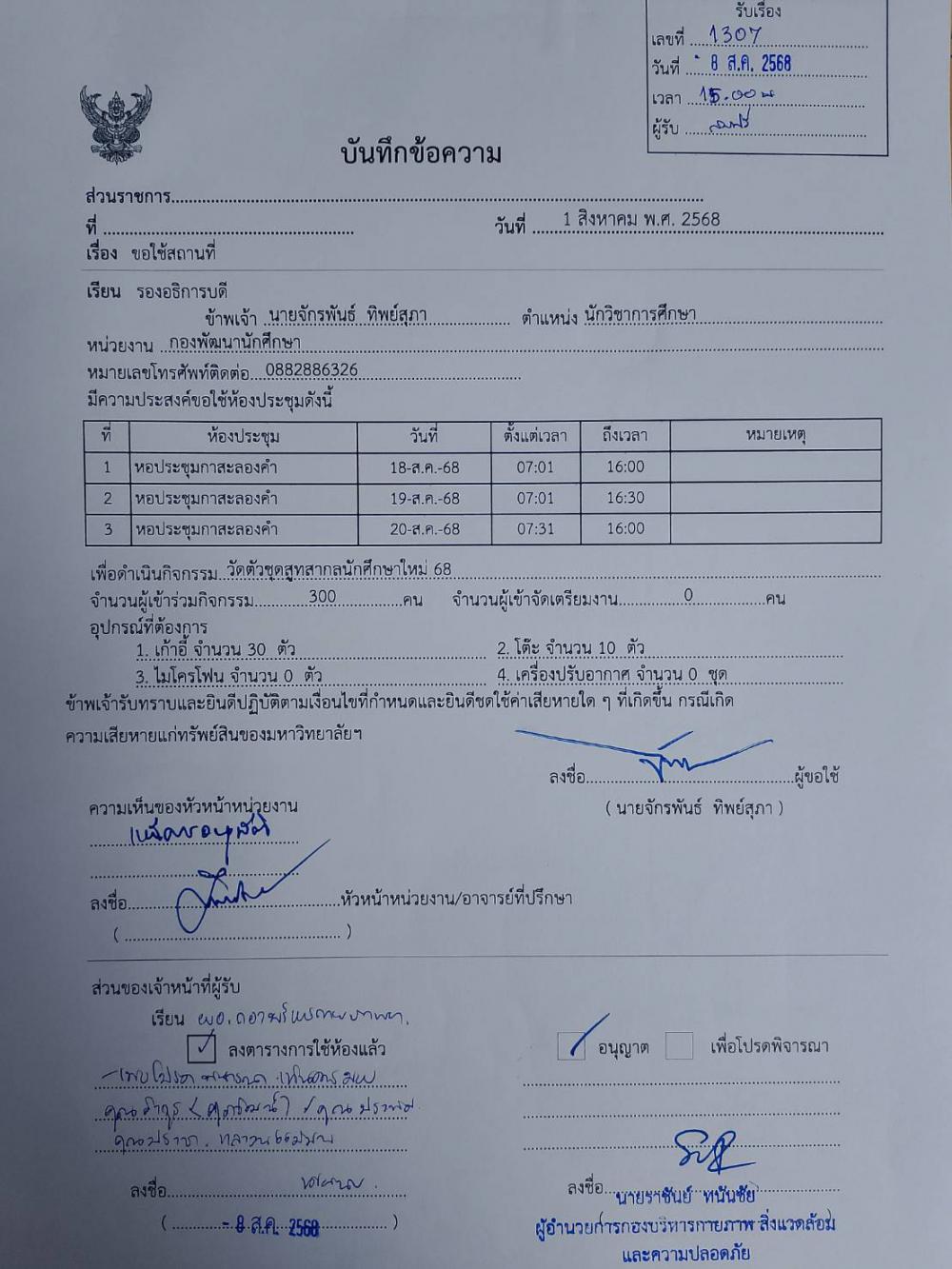 กองพัฒนานักศึกษา จัดสถานที่หอประชุมกาสะลองคำ วัดตัวชุดสูทสากลนักศึกษาใหม่ 68 วันที่ 18-20 ส.ค. 2568