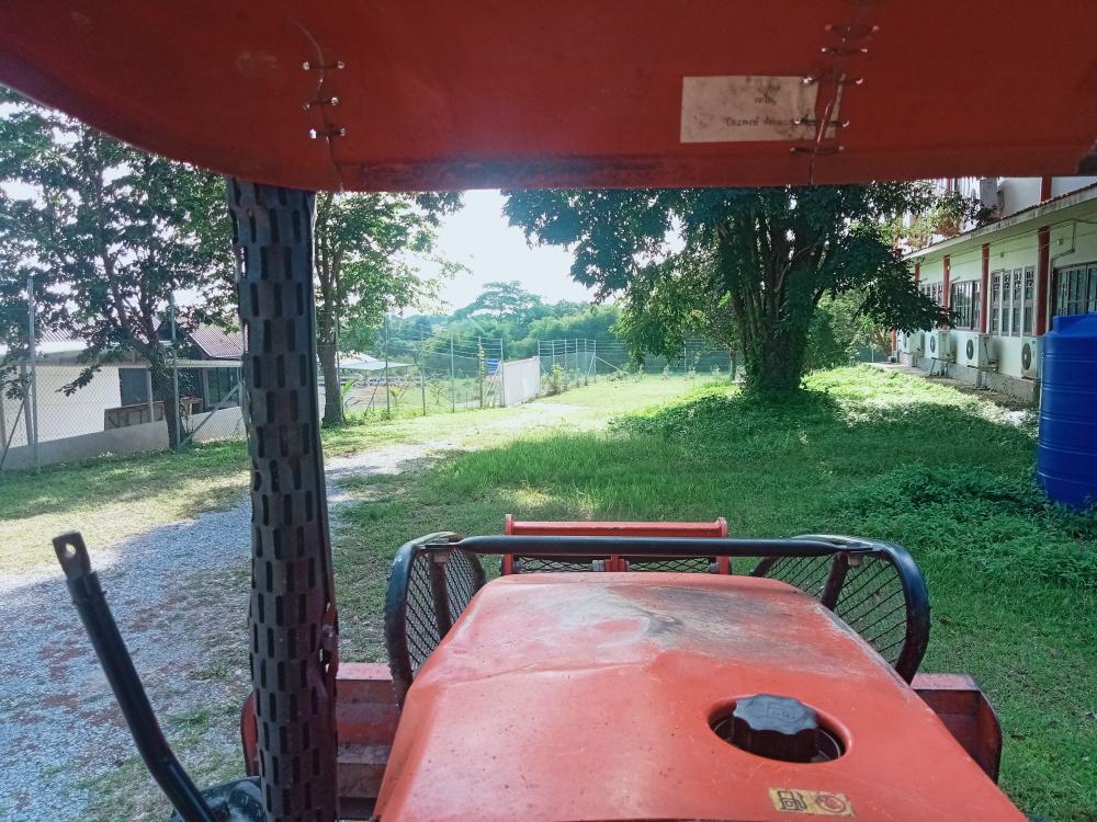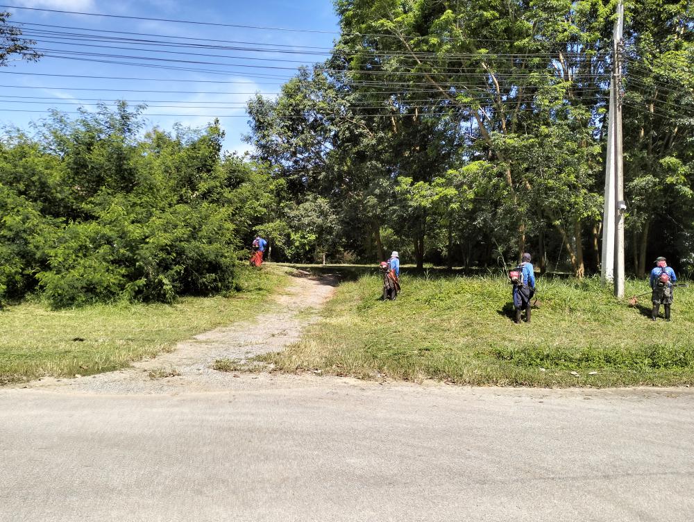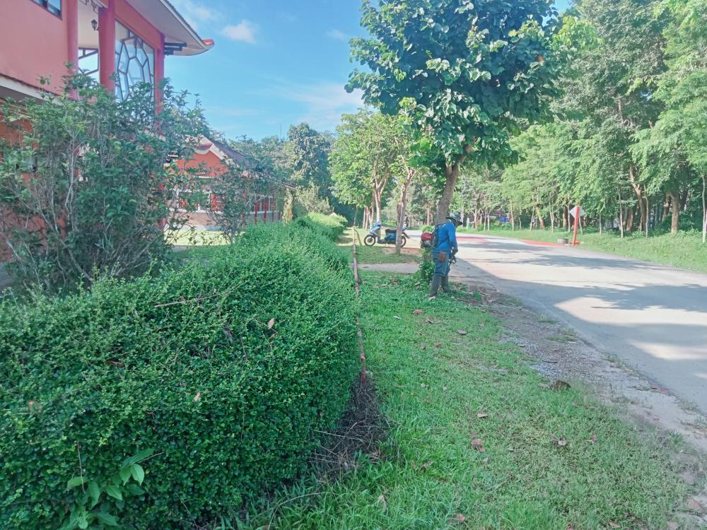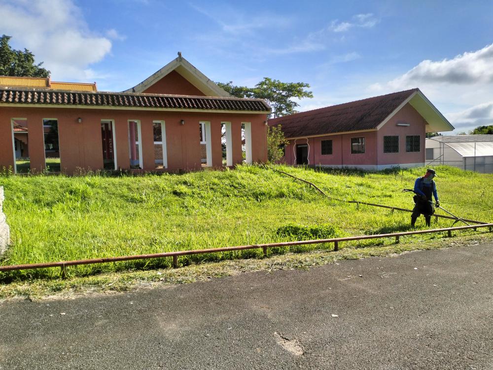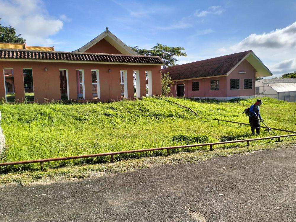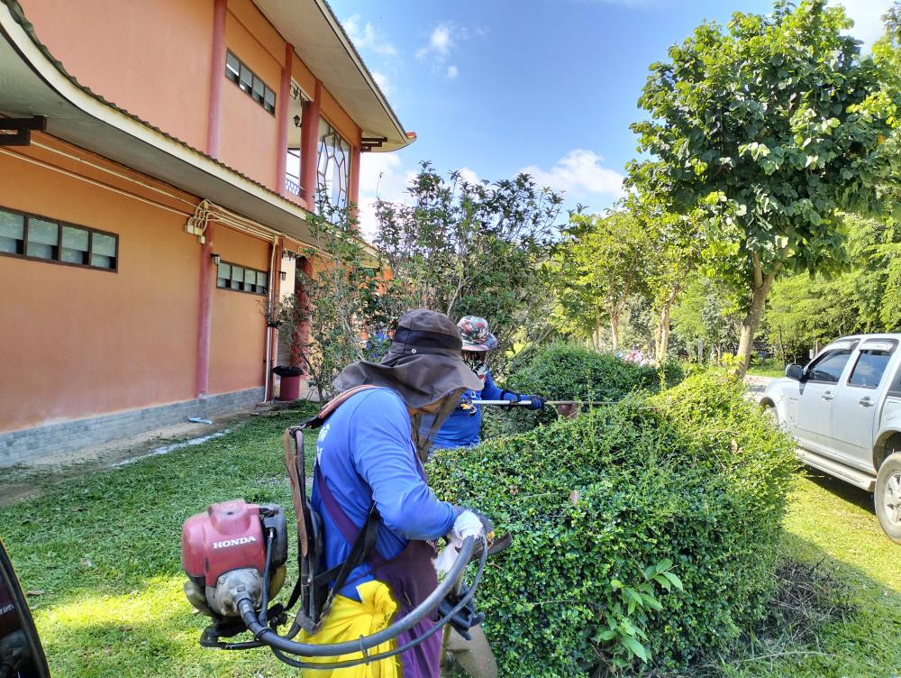 กองบริหารกายภาพฯ ตัดหญ้าอาคารในภาพไทยจีนและ อาคารชาติพันธุ์