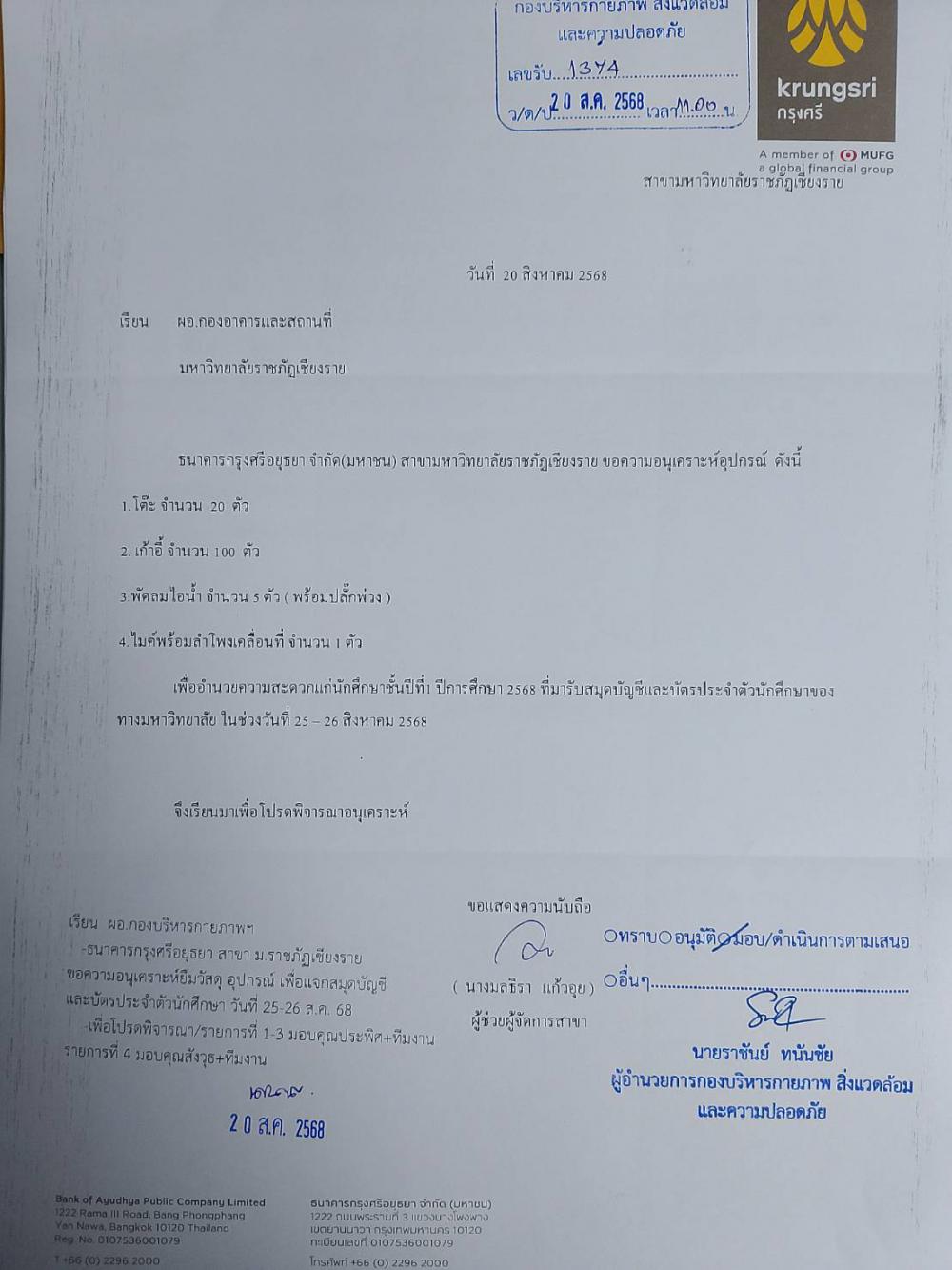 ภายนอกมหาวิทยาลัย ขนย้ายอุปกรณ์ งานรับบัตรประจำตัวนักศึกษา ณ ธนาคารกรุงศรีอยุธยา สาขามหาวิทยาลัยราชภัฏเชียงราย วันที่ 25-26 ส.ค. 2568 **รายการตามเอกสารแนบ**