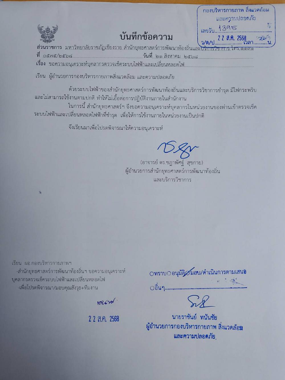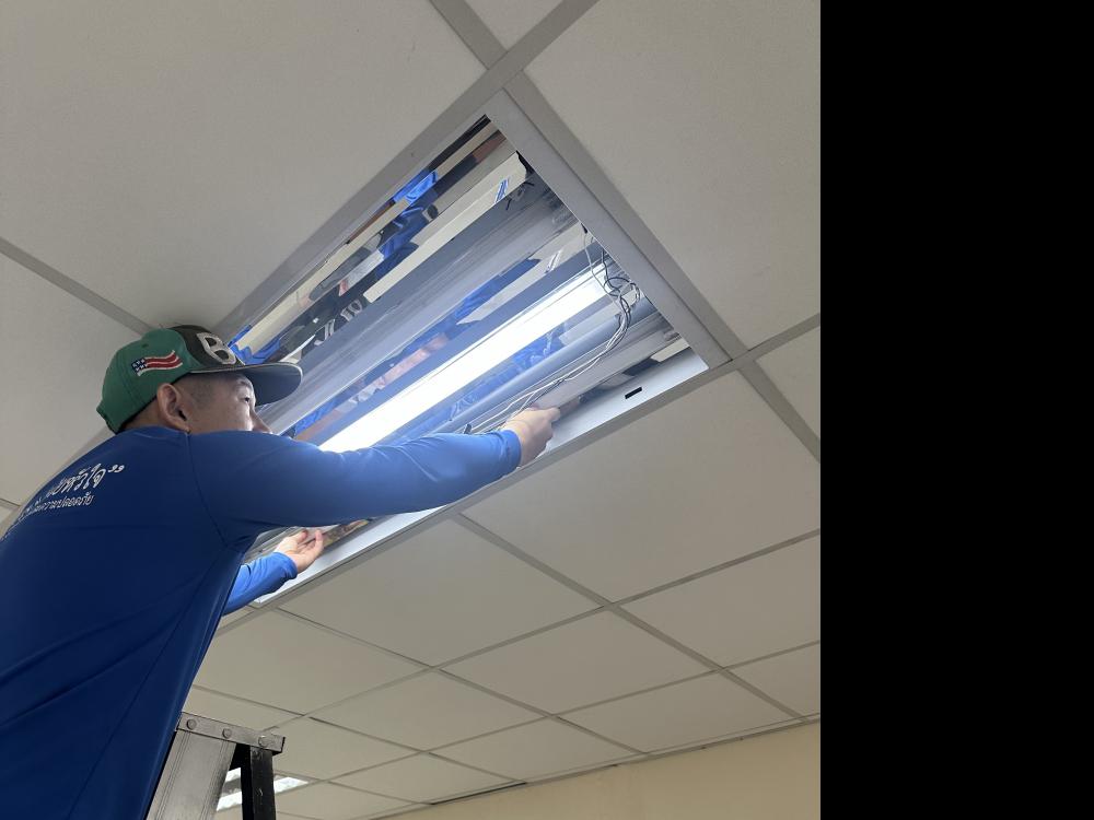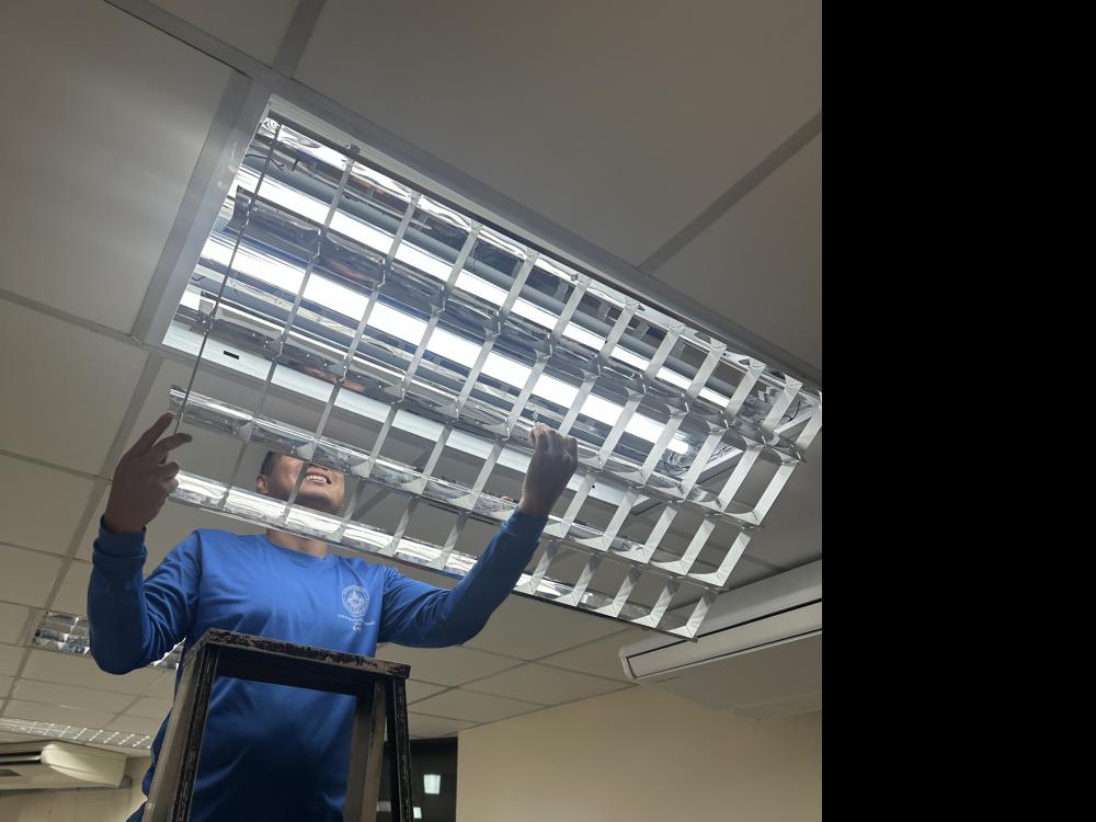 สำนักยุทธศาสตร์ฯ ตรอบสอบระบบไฟฟ้าและเปลี่ยนหลอดไฟ ภายในห้องสำนักงานสำนักยุทธศาสตร์ฯ