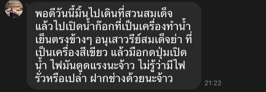 กองบริหารกายภาพฯ รับแจ้งว่าตู้น้ำดื่ม บริเวณข้างอนุสาวรีย์สมเด็จย่า มีกระแสไฟฟ้ารั่ว