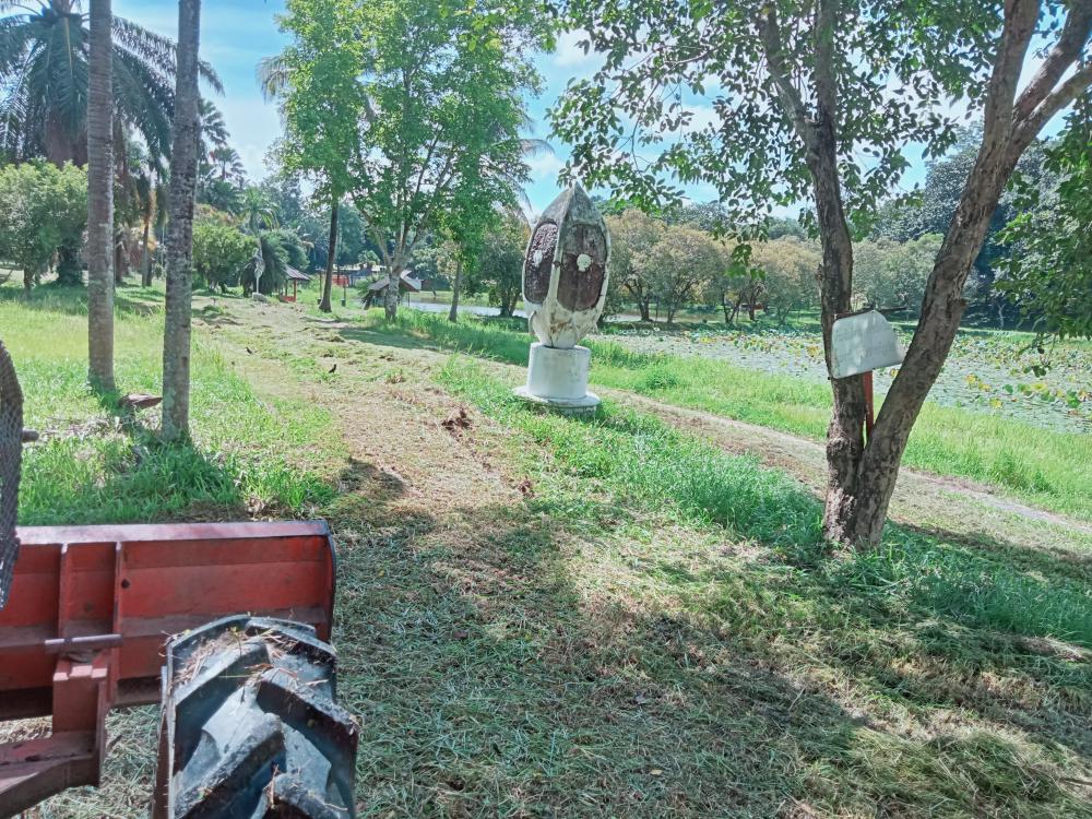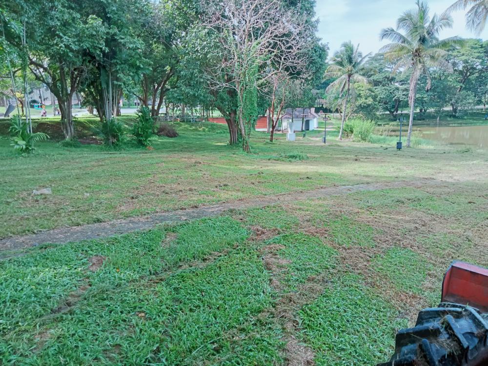 กองบริหารกายภาพฯ ขับแทรกเตอร์ตัดหญ้าลานหลังเวทีกลางแจ้งและหน้าเสาธง ศูนย์วัฒนธรรม