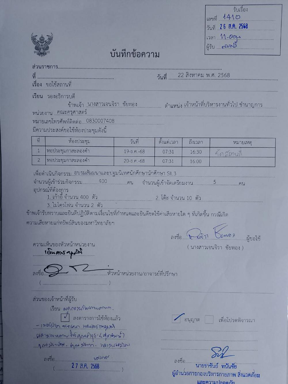 จัดสถานที่หอประชุมกาสะลองคำ อบรมสัมมนาและปฐมนิเทศนักศึกษา SIL3