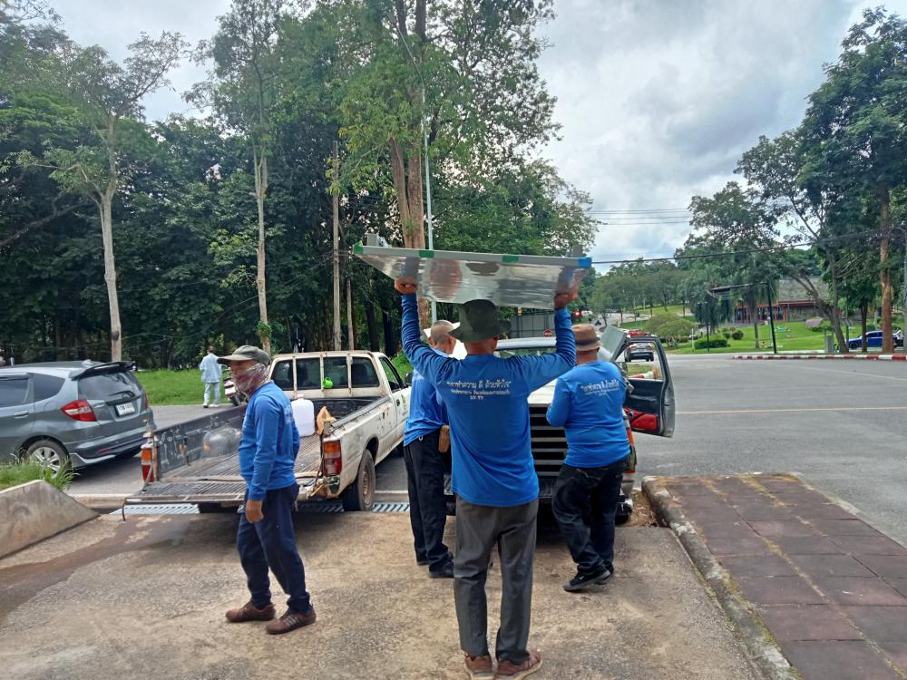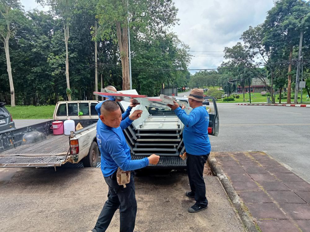 กองบริหารกายภาพฯ เก็บของต่างๆหน้าธนาคารกรุงศรีหลังเสร็จสิ้น งาน ทำบัตรนักศึกษา