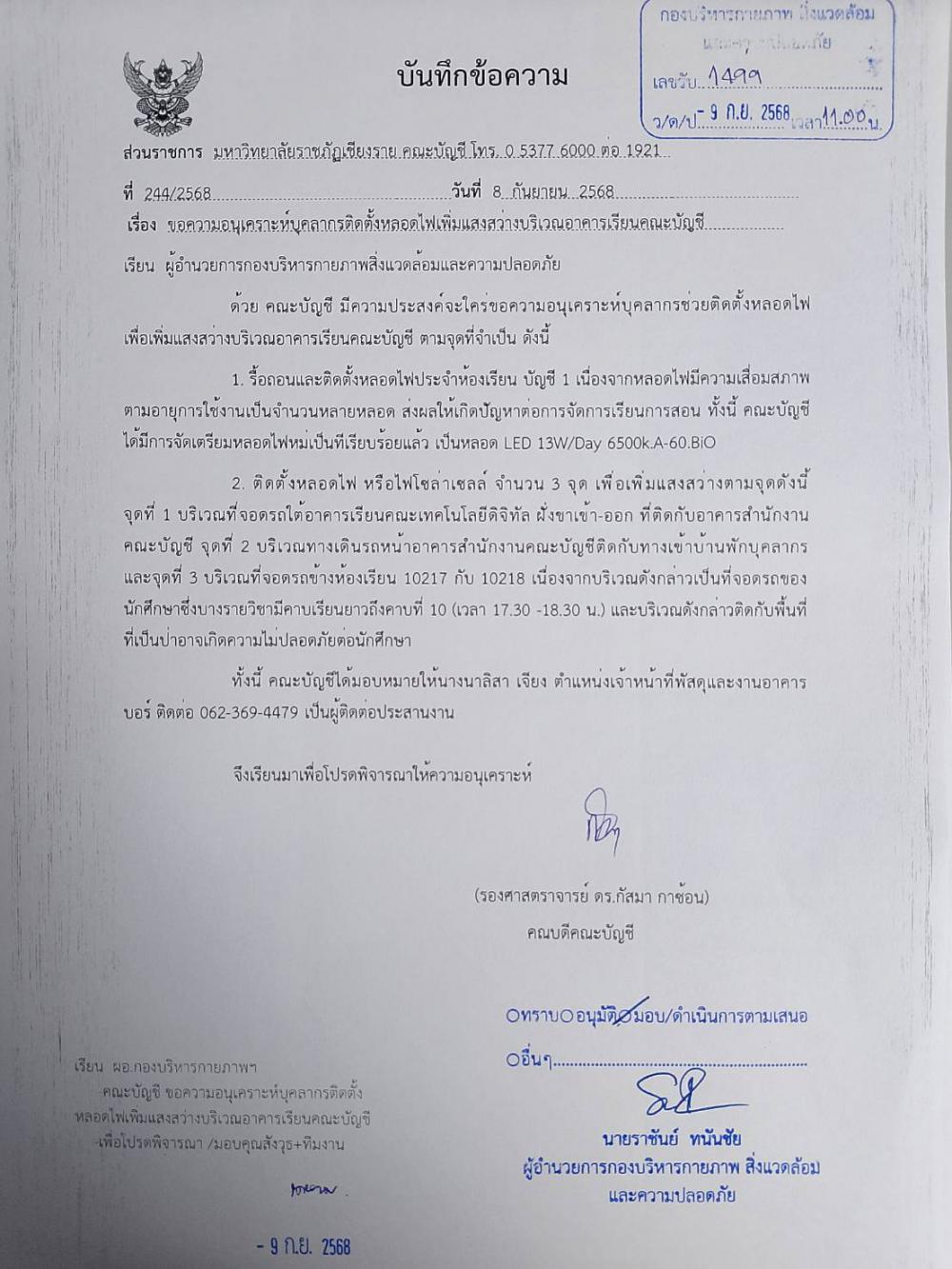 คณะบัญชี ติดตั้งหลอดไฟเพิ่มแสงสว่างบริเวณอาคารเรียนคณะบัญชี จำนวน 2 รายการ