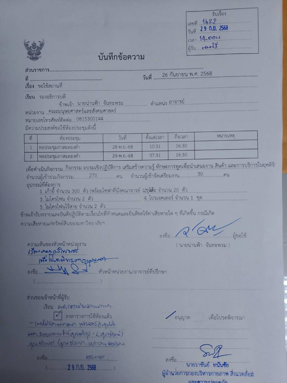 ประเภทงาน: จัดสถานที่ ผู้ประสาน: อ.น่านฟ้า 0815300144 รับแจ้ง: 11 กันยายน 2568