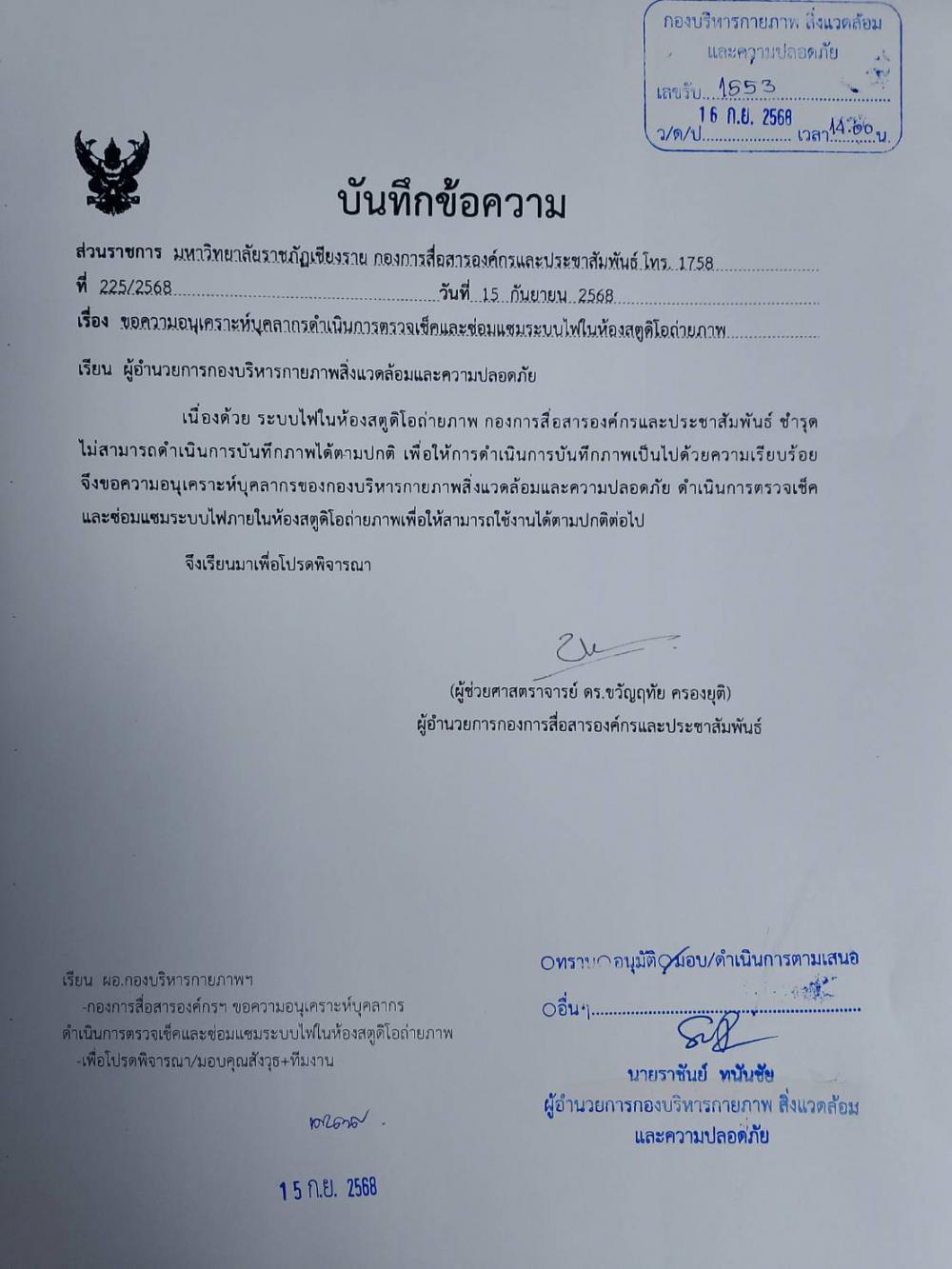 ตรวจสอบและซ่อมแซมระบบไฟฟ้าห้องสตูดิโอถ่ายภาพ กองการสื่อสารองค์กรและประชาสัมพันธ์ อาคารสำนักงานอธิการบดี