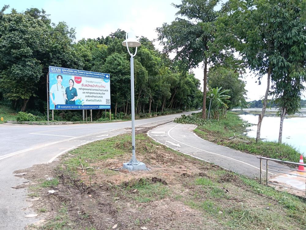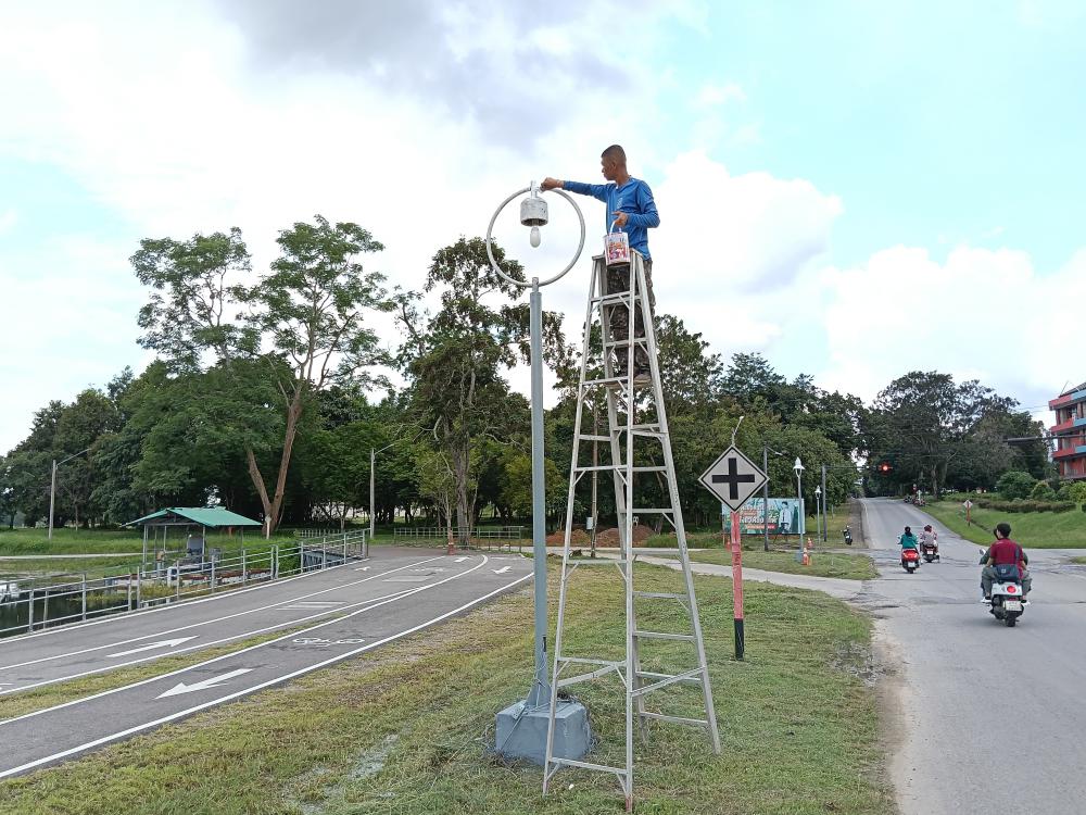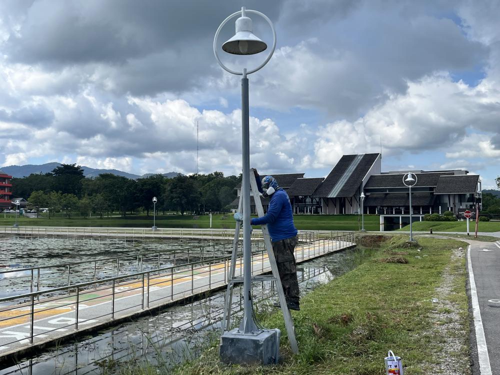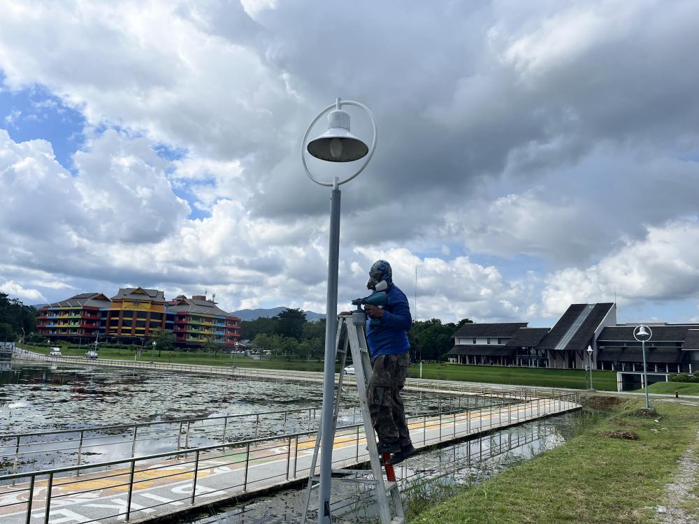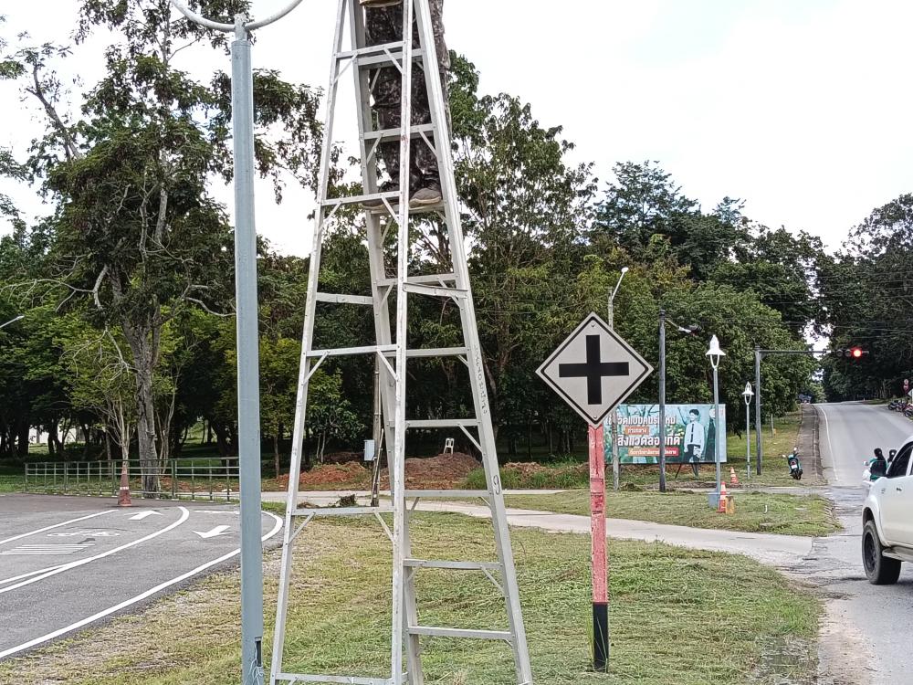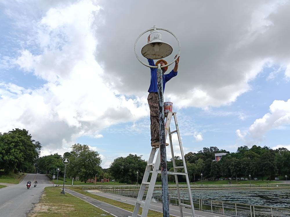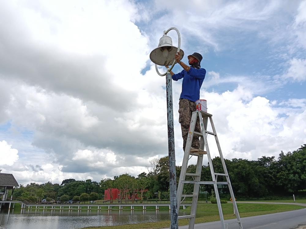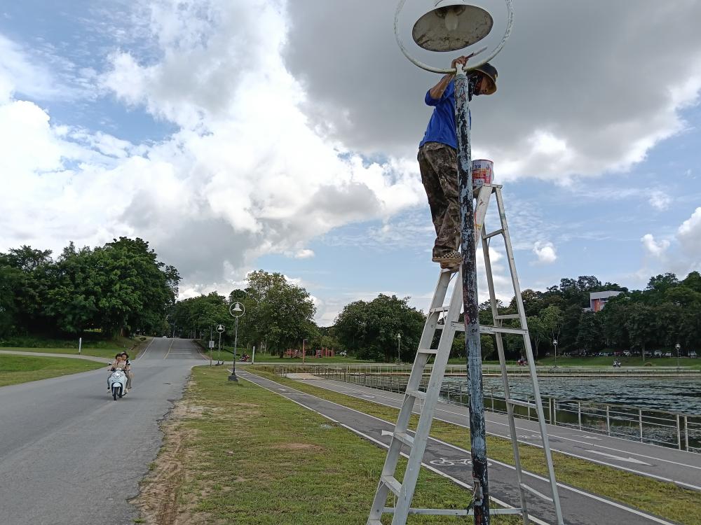 ขัดทำความสะอาดเสาไฟกิ่ง ทาสีเสาไฟกิ่ง