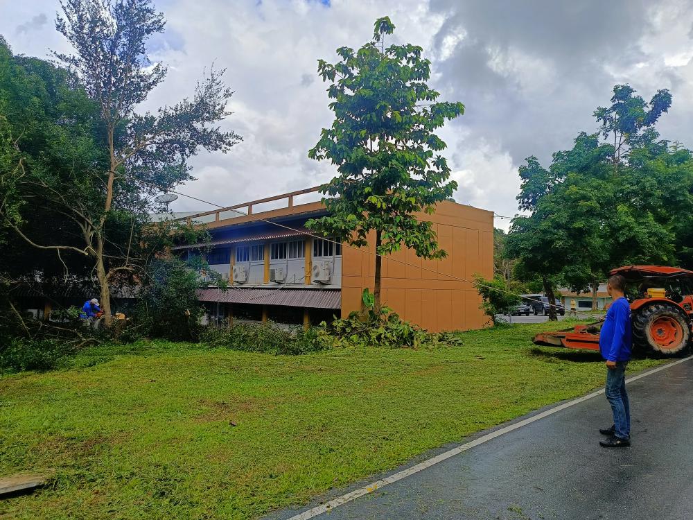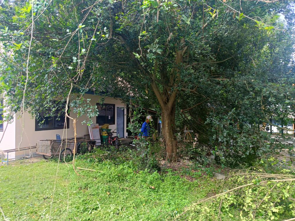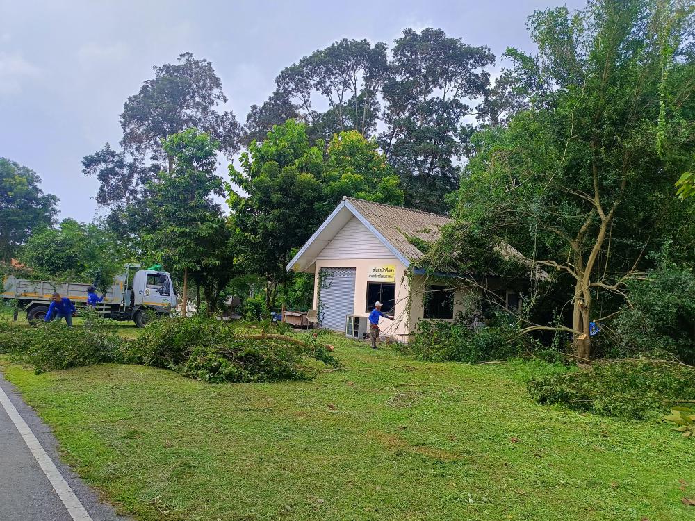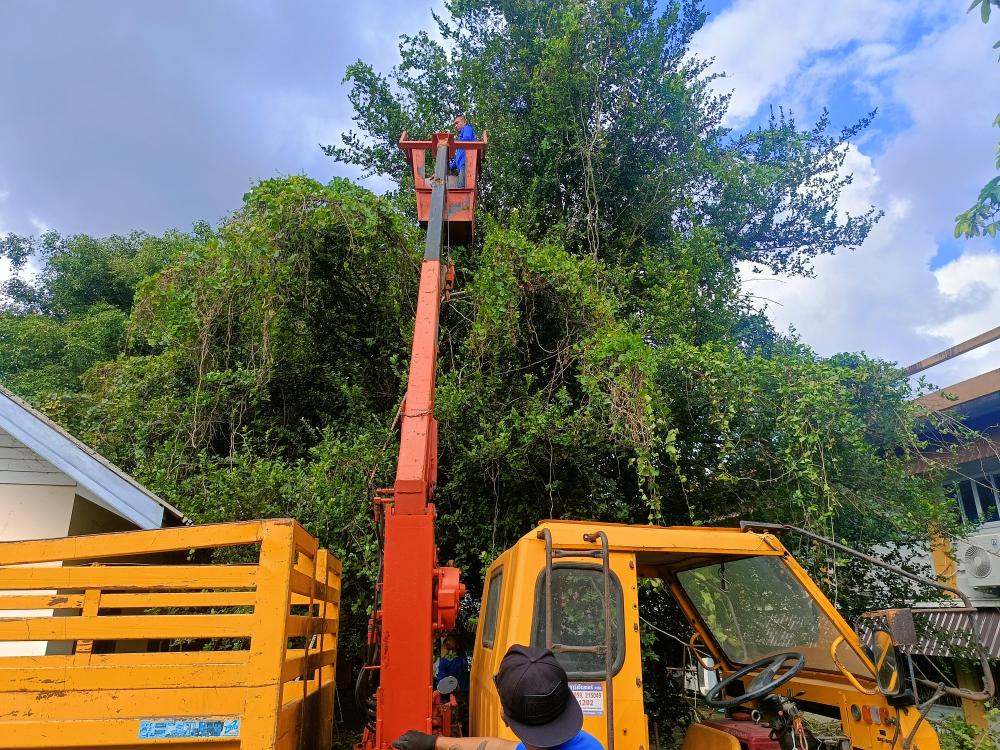 ตัดแต่งต้นไม้ที่ยืนต้นสูง บริเวณด้านหลังและด้านข้างอาคารคณะสังคมศาสตร์