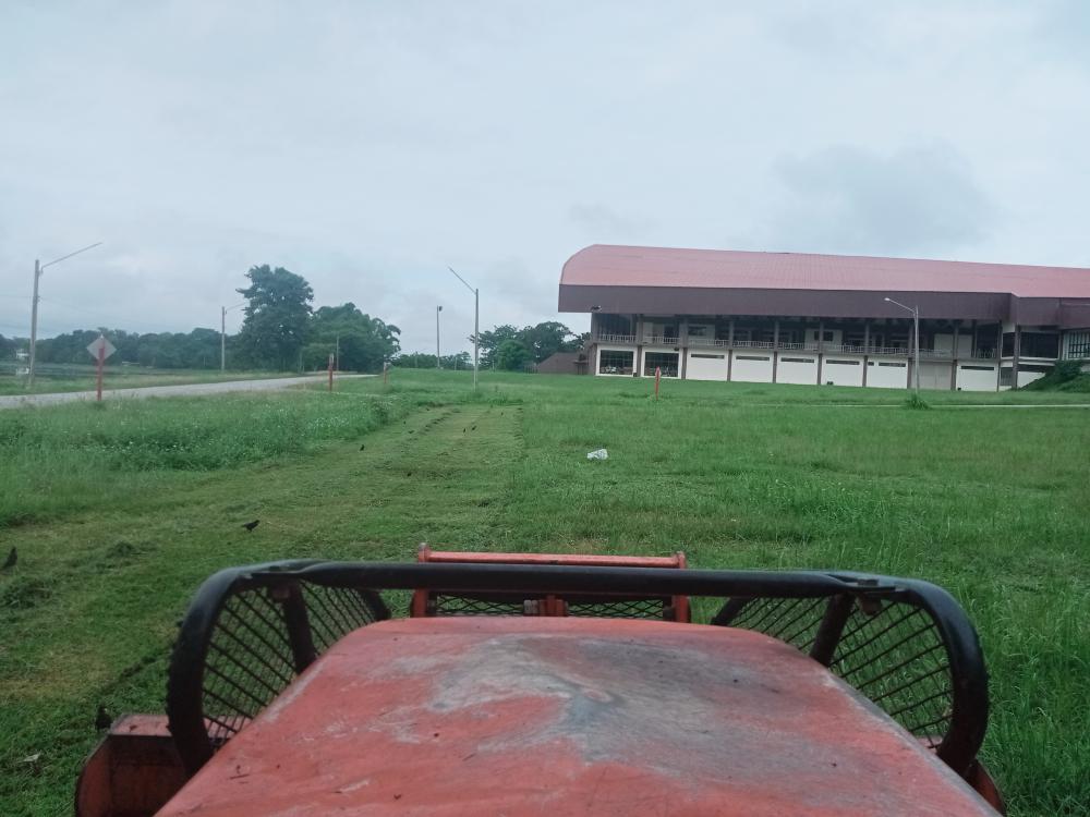 กองบริหารกายภาพฯ ขับแทรกเตอร์ตัดหญ้าลานลิ้นจี่ ข้างหอประชุมใหญ่