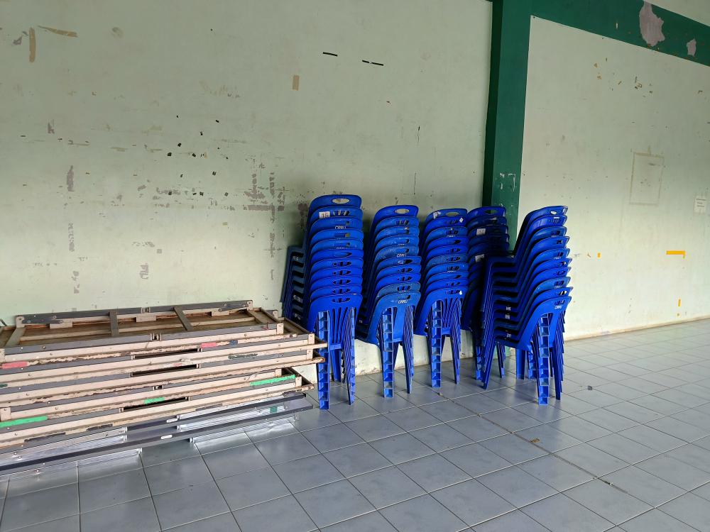 ขนโต๊ะจำนวน 4 ตัวและเก้าอี้ 60 ตัวไปโรงยิม