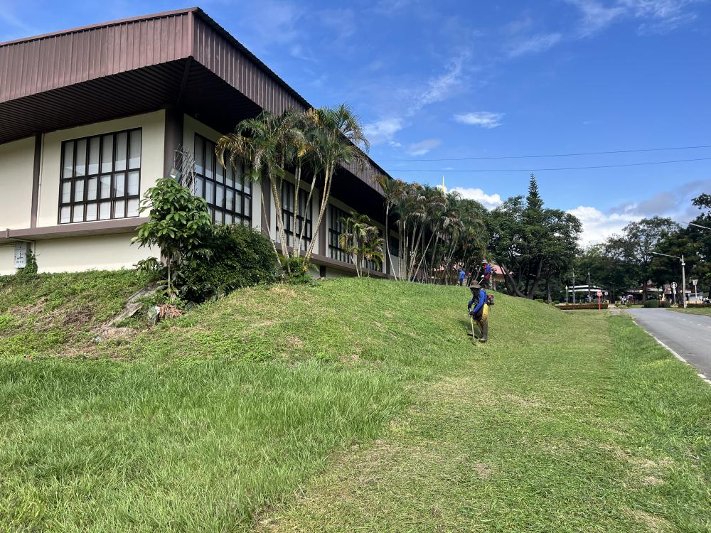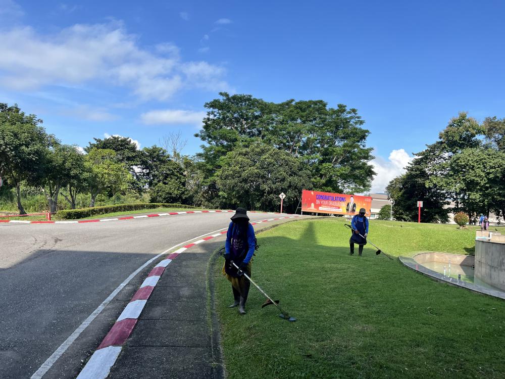 กองบริหารกายภาพฯ ตัดหญ้ารอบหอประชุมใหญ่