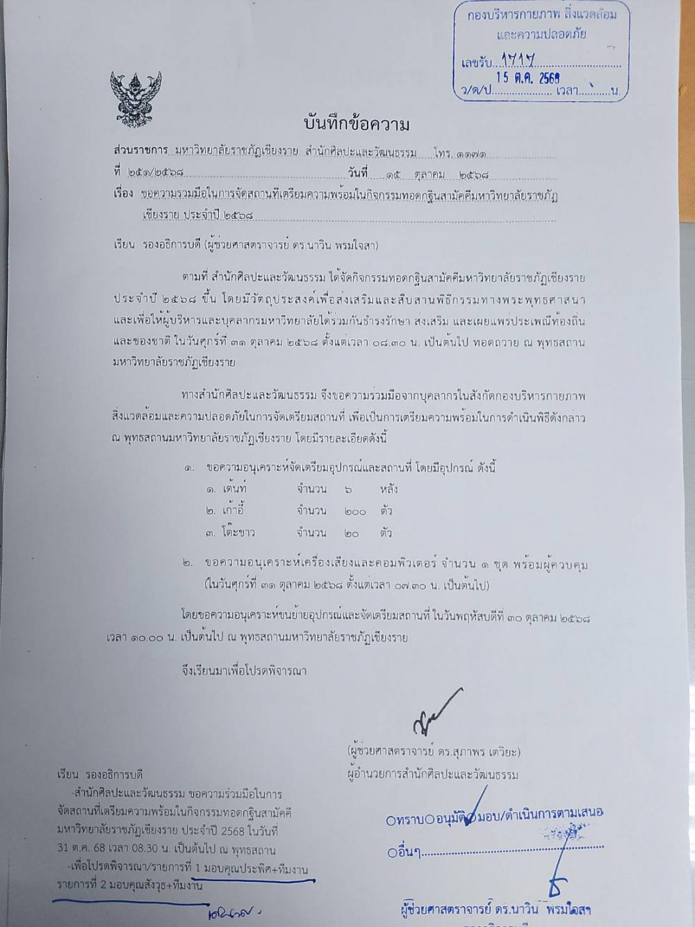 สำนักศิลปะฯ จัดสถานที่งานทอดกฐินสามัคคี มรภ.เชียงราย ประจำปี 2568 ณ พุทธสถาน