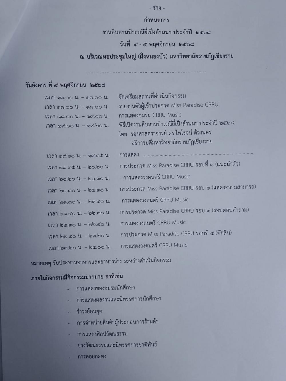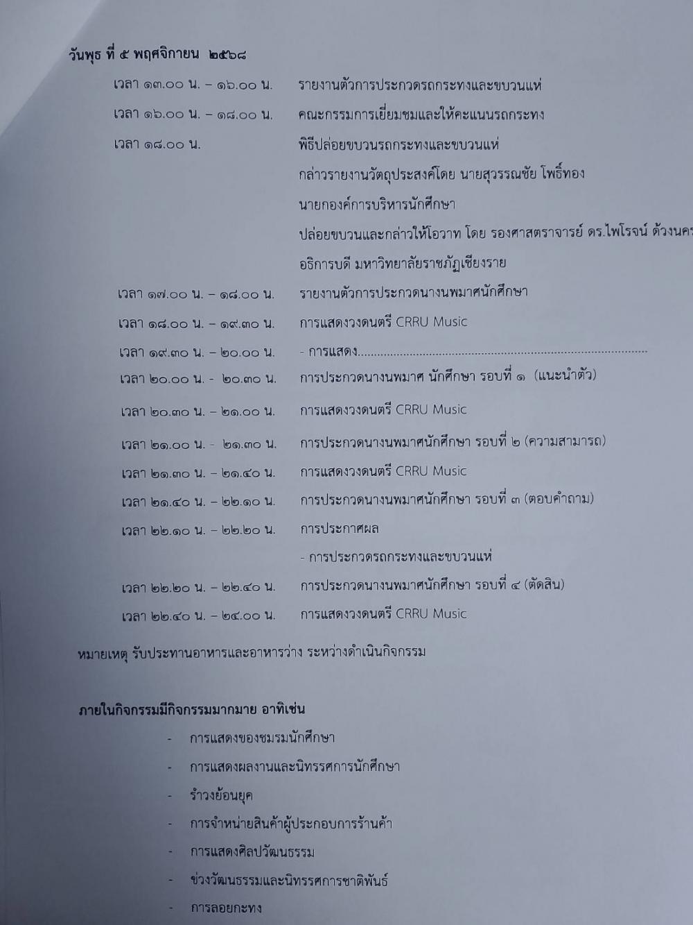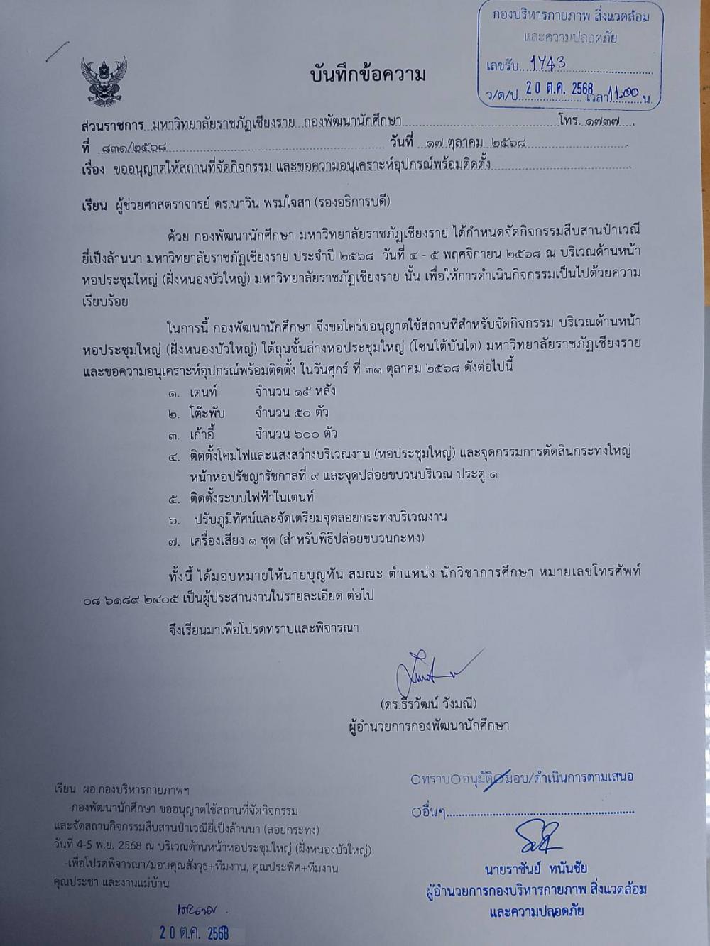 กองพัฒนานักศึกษา ติดตั้งระบบไฟฟ้าและไฟส่องสว่าง ภายในเต้นท์ หลังหอประชุมใหญ่ , หน้าหอปรัชญา ร.9 และจุดปล่อยขบวนบริเวณประตู 1 กิจกรรมสืบสานป๋าเวณียี่เป็งล้านนา มรภ.เชียงราย ประจำปี 2568