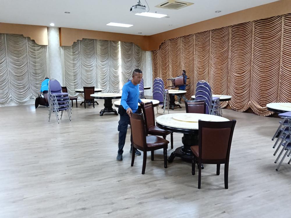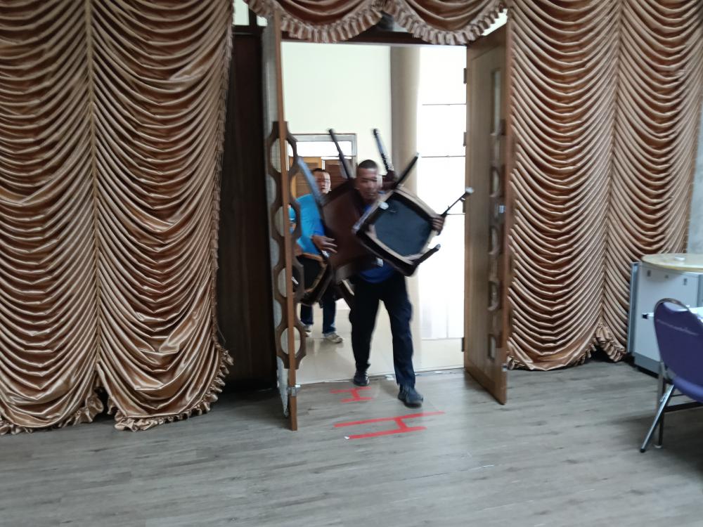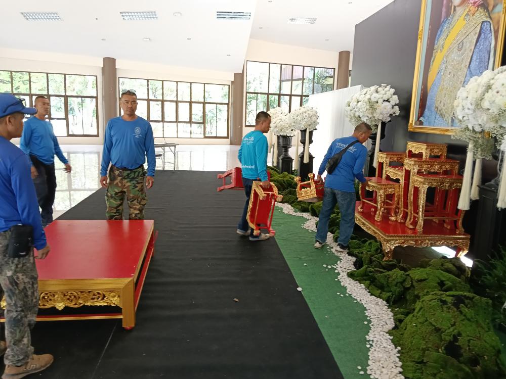 กองบริหารกายภาพฯ เก็บขนเก้าอี้ในหอประชุมใหญ่ เก็บชุดโต๊ะหมู่ส่งคืน หอปรัชญา รัชกาลที่9