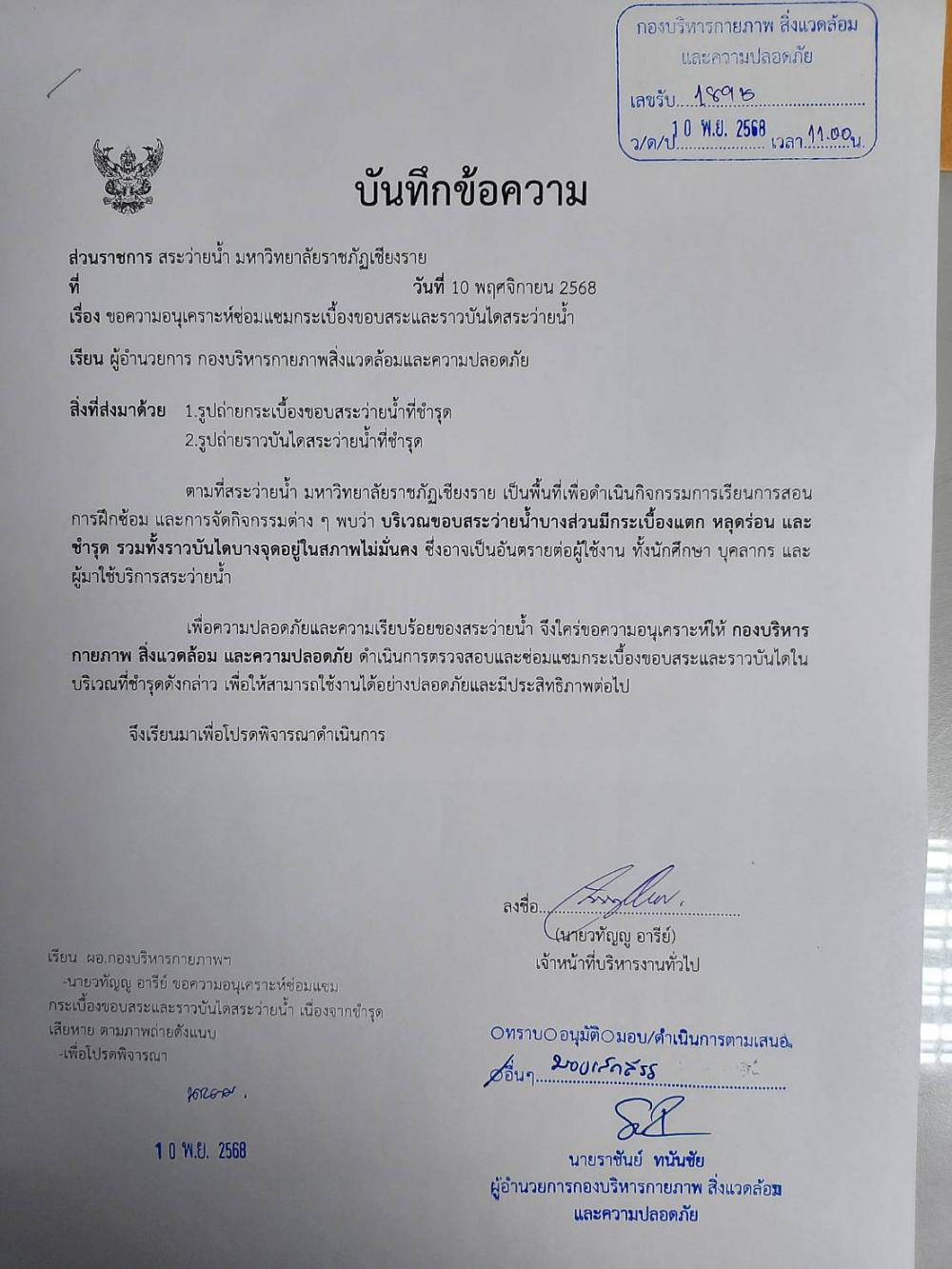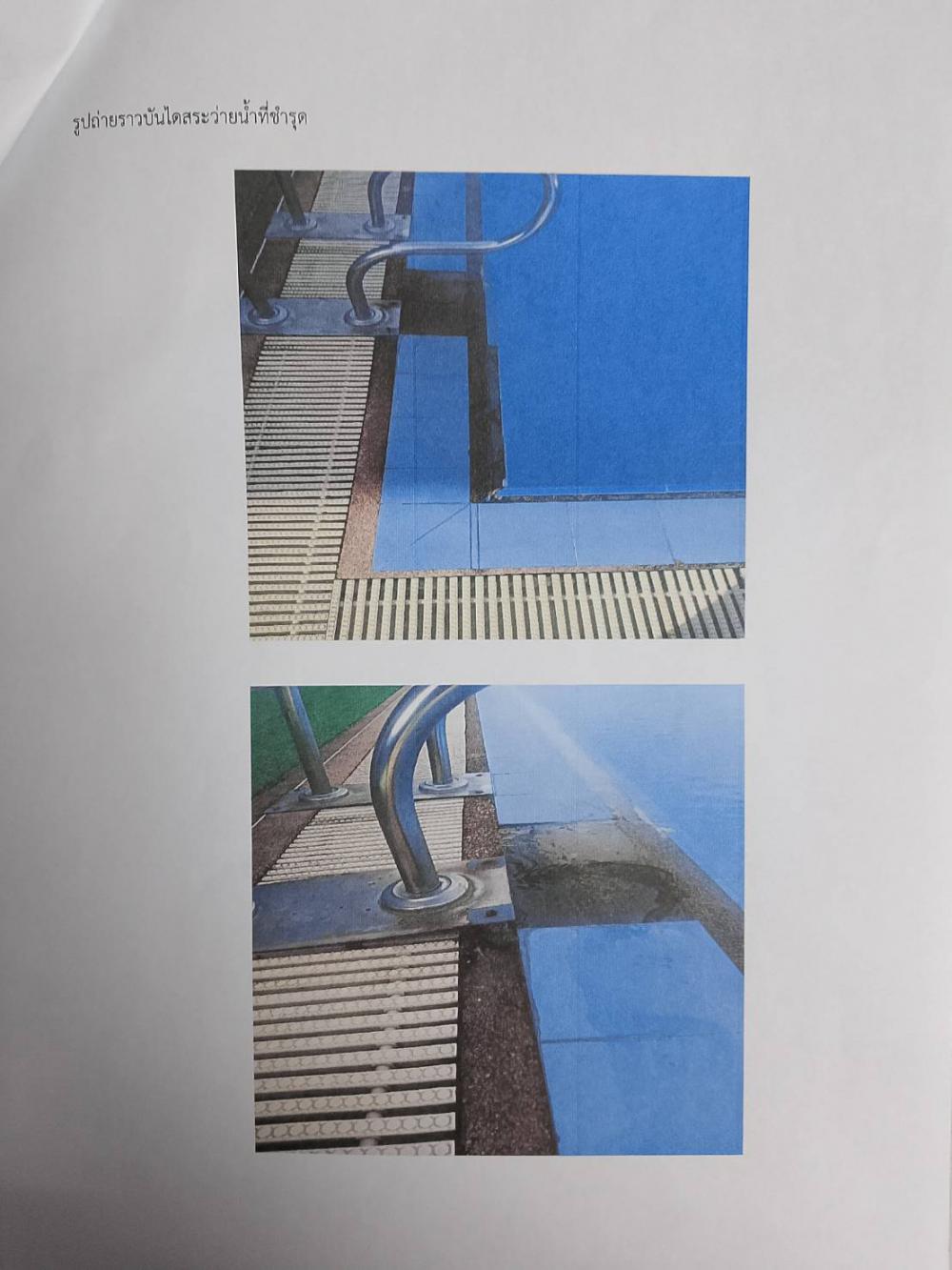 กองบริหารกายภาพฯ ตรวจสอบและซ่อมแซมกระเบื้องขอบสระว่ายน้ำและราวบันได เนื่องจากชำรุดเสียหาย