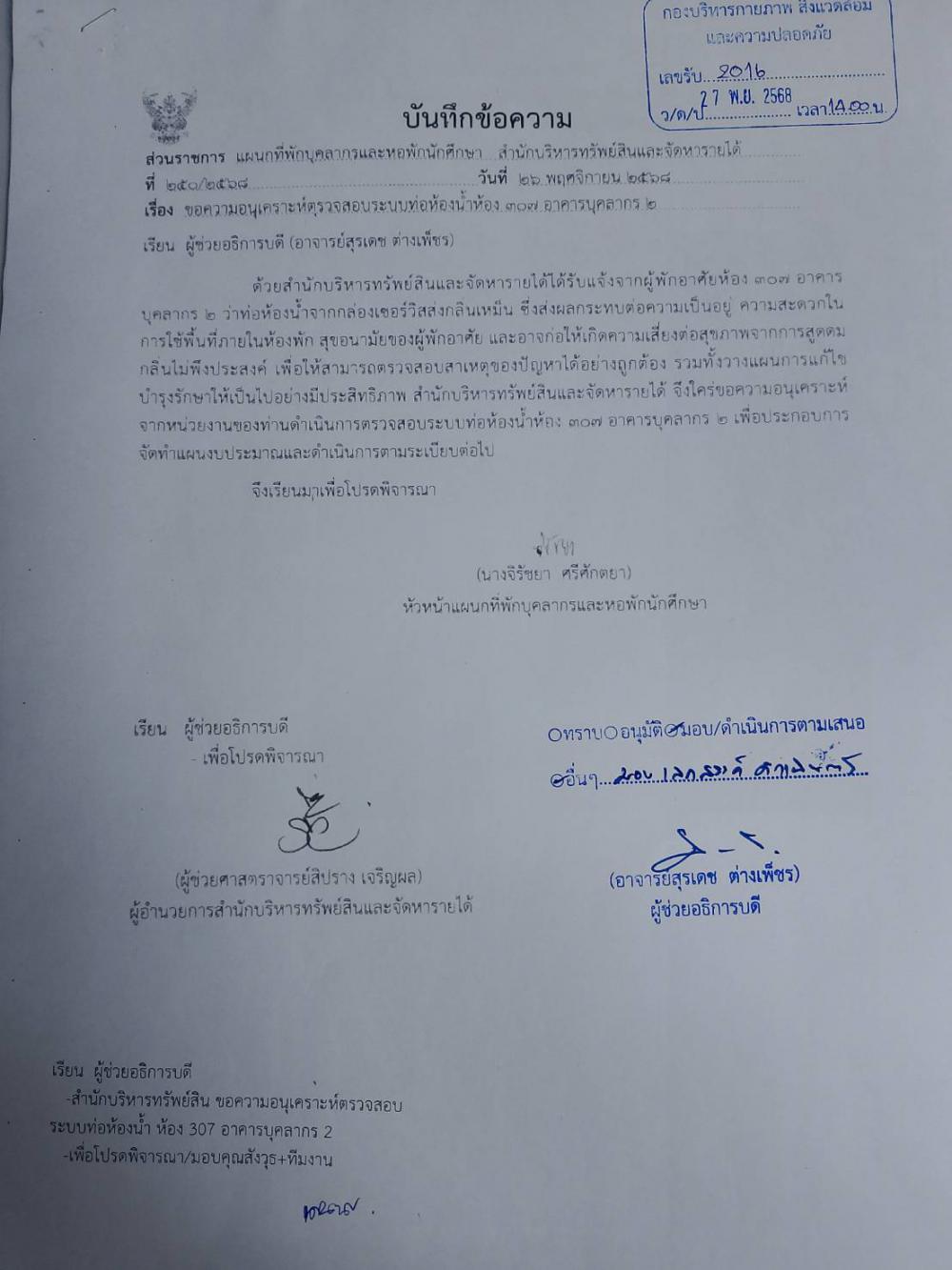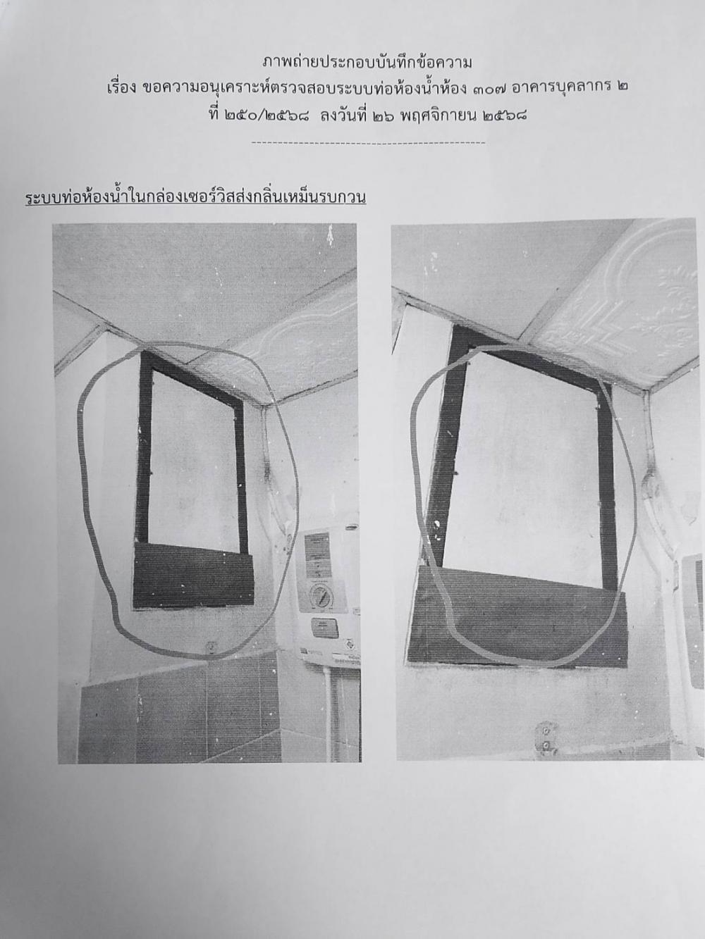 ตรวจสอบระบบท่อห้องน้ำ ห้อง 907 อาคารหอพักบุคลากร 2