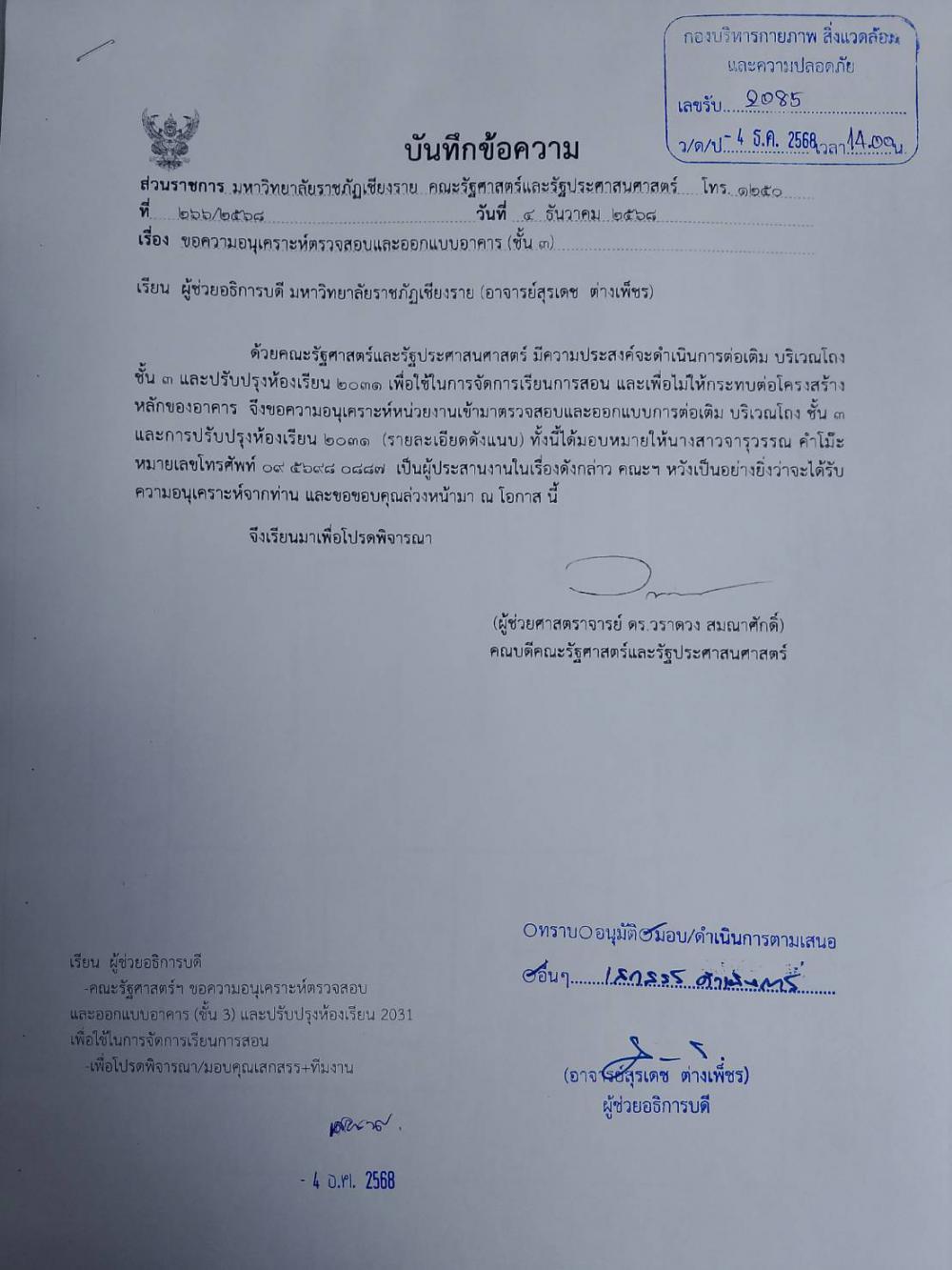 คณะรัฐศาสตร์ฯ ตรวจสอบและออกแบบอาคาร (ชั้น 3) อาคารคณะรัฐศาสตร์ฯ บริเวณโถงชั้น 3 และ ห้องเรียน 2031