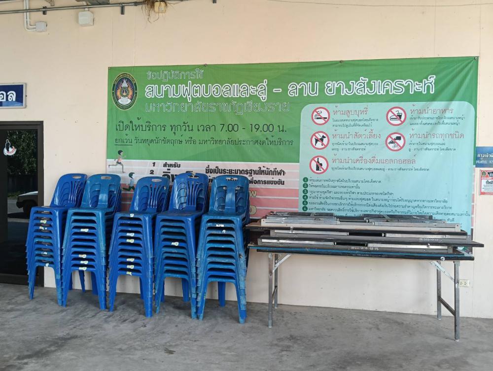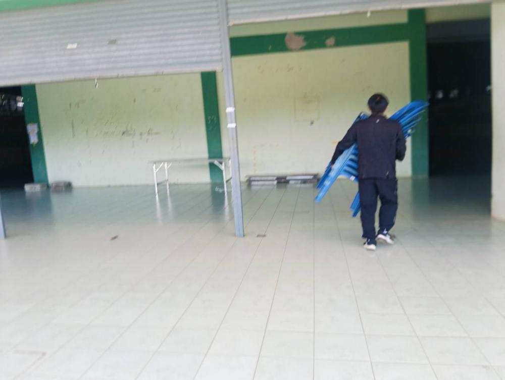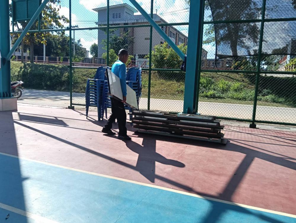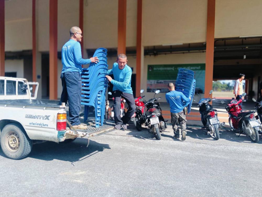 ขนโต๊ะเก้าอี้อุปกรณ์ต่างๆ ไปตามสนามกีฬาที่จะใช้ในการแข่งขันกีฬา
