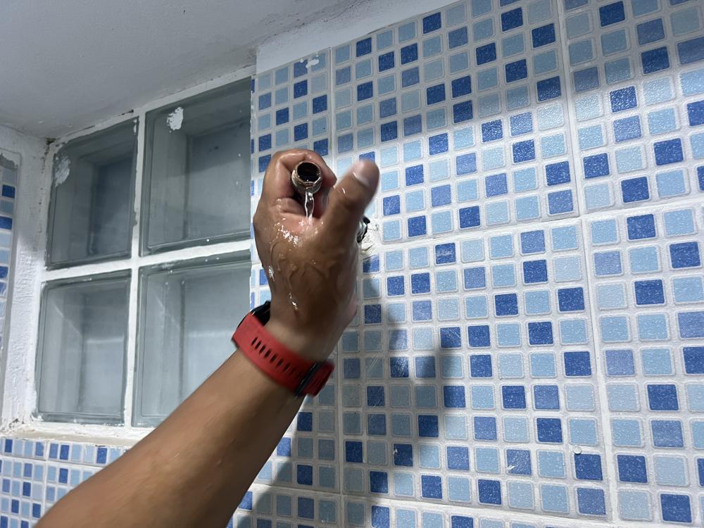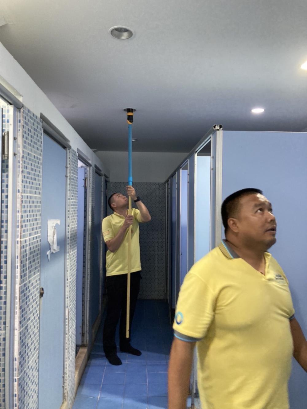 เปลี่ยนหลอดไฟและซ่อมเปลี่ยนฝักบัวในห้องน้ำสระว่ายน้ำ