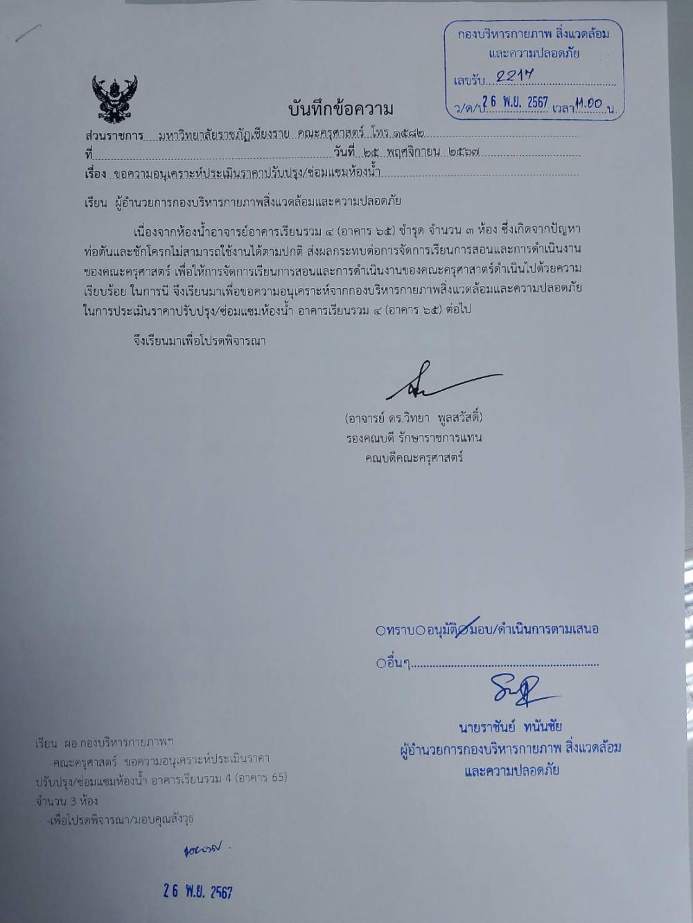 ประเมินราคาปรับปรุง หรือซ่อมแซมห้องน้ำ อาคาร 65 จำนวน 3 ห้อง