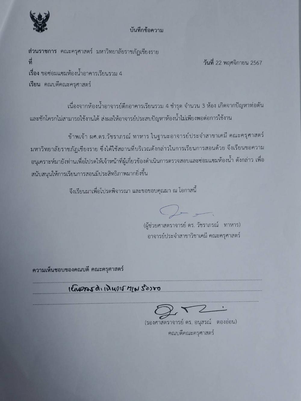 คณะครุศาสตร์ ห้องน้ำอาจารย์ อาคาร 65 ชำรุด จำนวน 3 ห้อง จากปัญหาท่อตัน และชักโครกไม่สามารถใช้งานได้ ตามปกติ