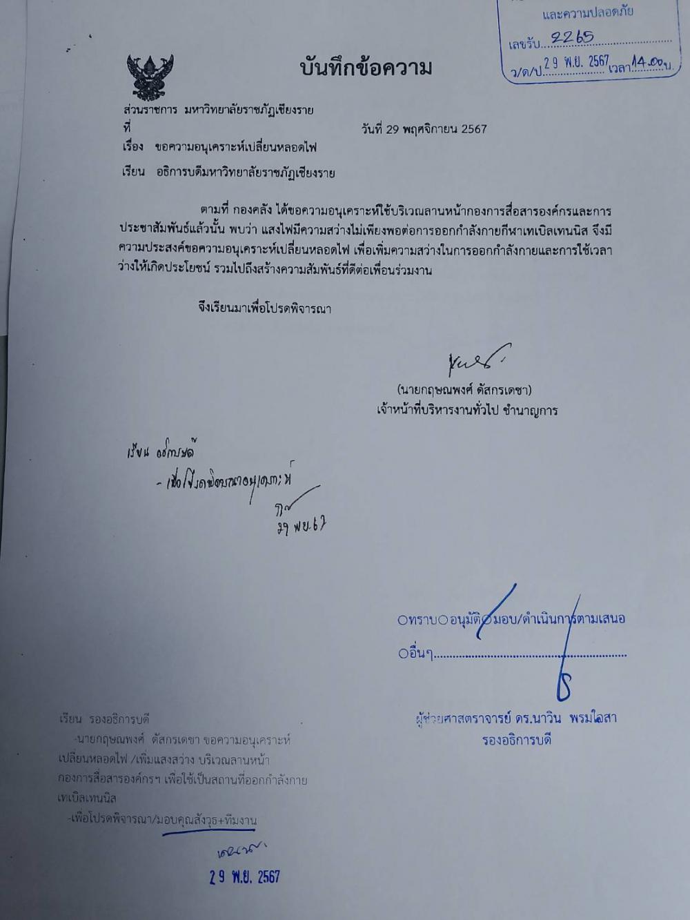 กองคลัง เปลี่ยนหลอดไฟ หรือเพิ่มแสงสว่างบริเวณลานหน้ากองการสื่อสารองค์กรฯ