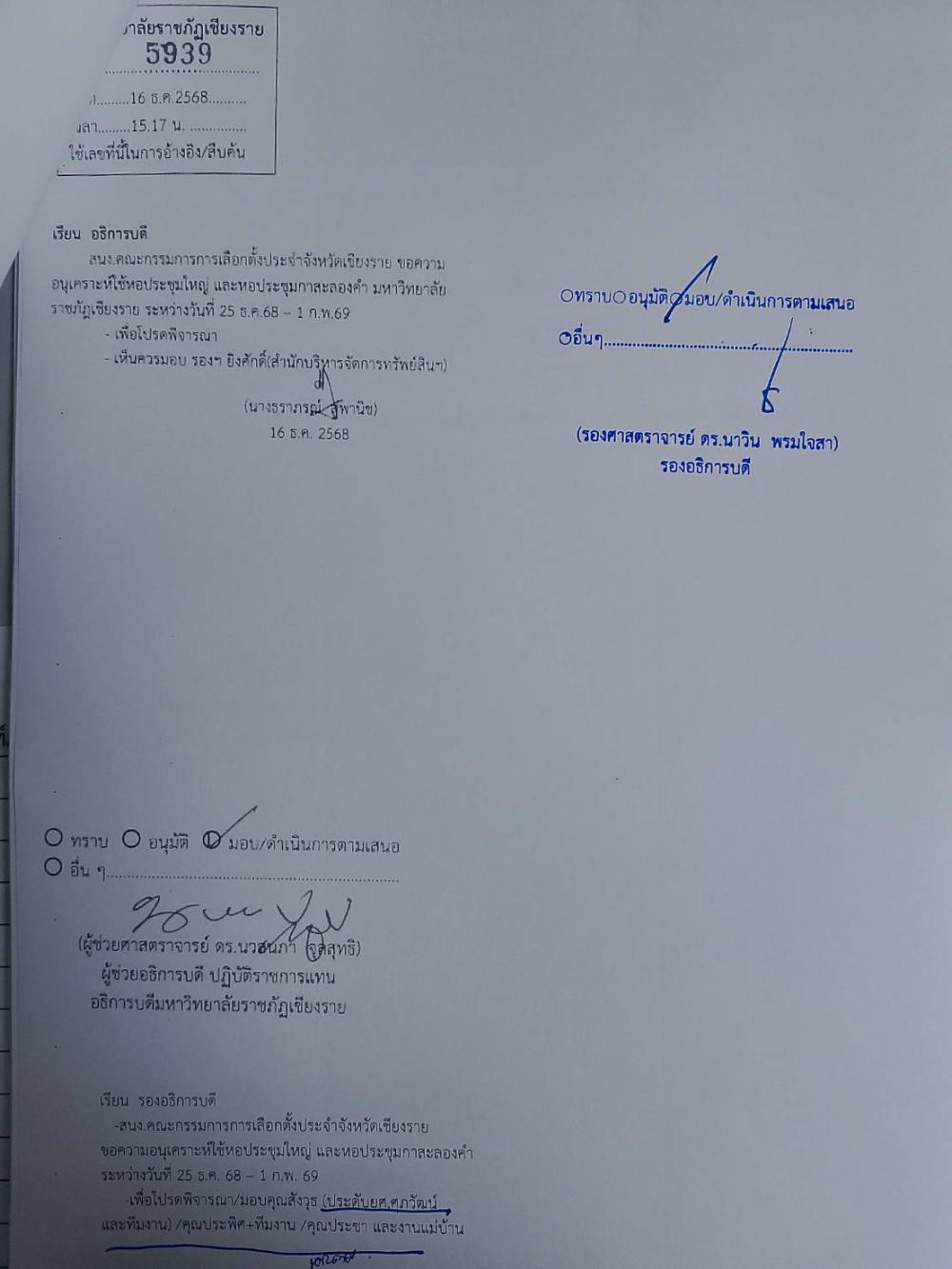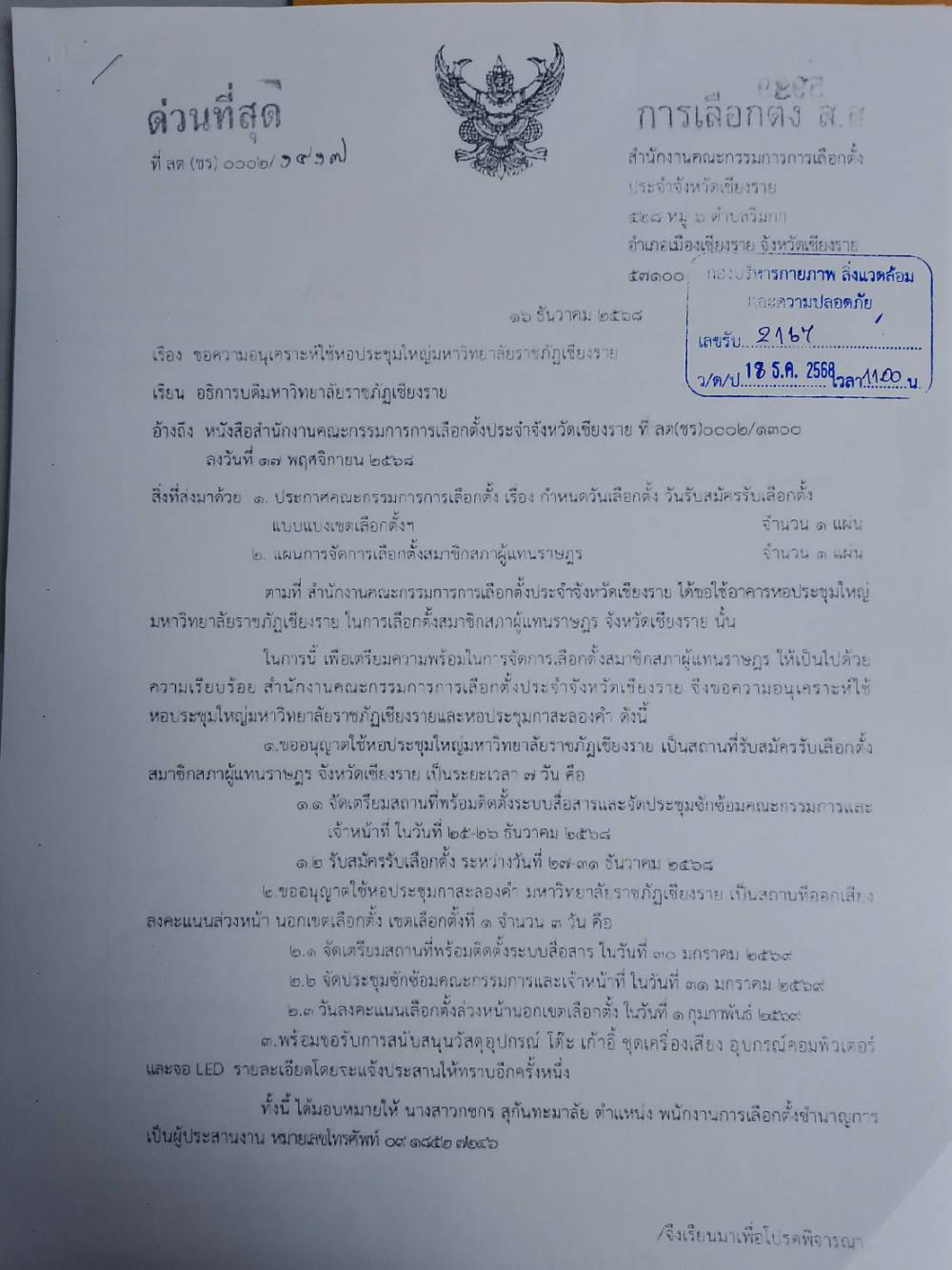 สำนักบริหารทรัพย์สินฯ จัดสถานที่หอประชุมใหญ่ สมัครรับเลือกตั้ง ส.ส. จังหวัดเชียงราย วันที่ 26-31 ธ.ค. 2568