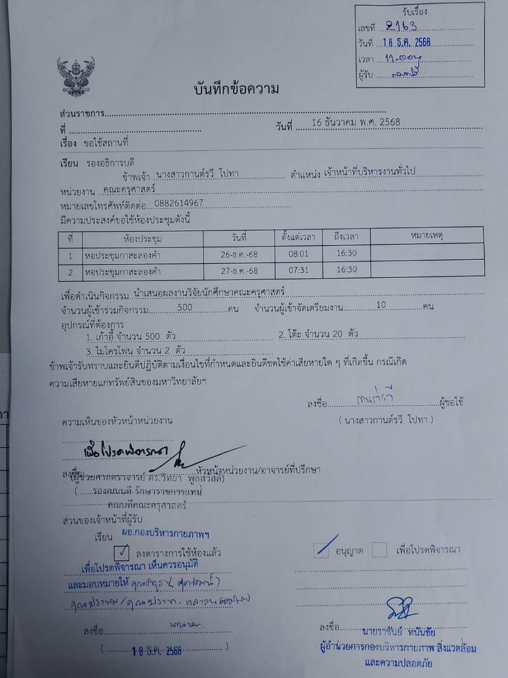 คณะครุศาสตร์ จัดสถานที่หอประชุมกาสะลองคำ จัดกิจกรรมนำเสนอผลงานวิจัยนักศึกษาคณะครุศาสตร์ 26-27 ธ.ค.2568