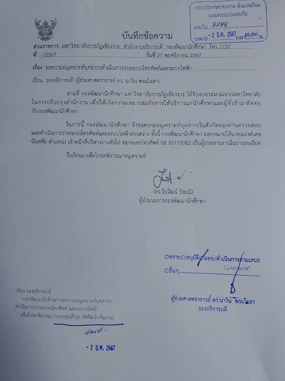 กองพัฒนานักศึกษา วางระบบโทรศัพท์และไฟฟ้าส่องสว่าง ภายในห้องสำนักงานกองพัฒนานักศึกษา