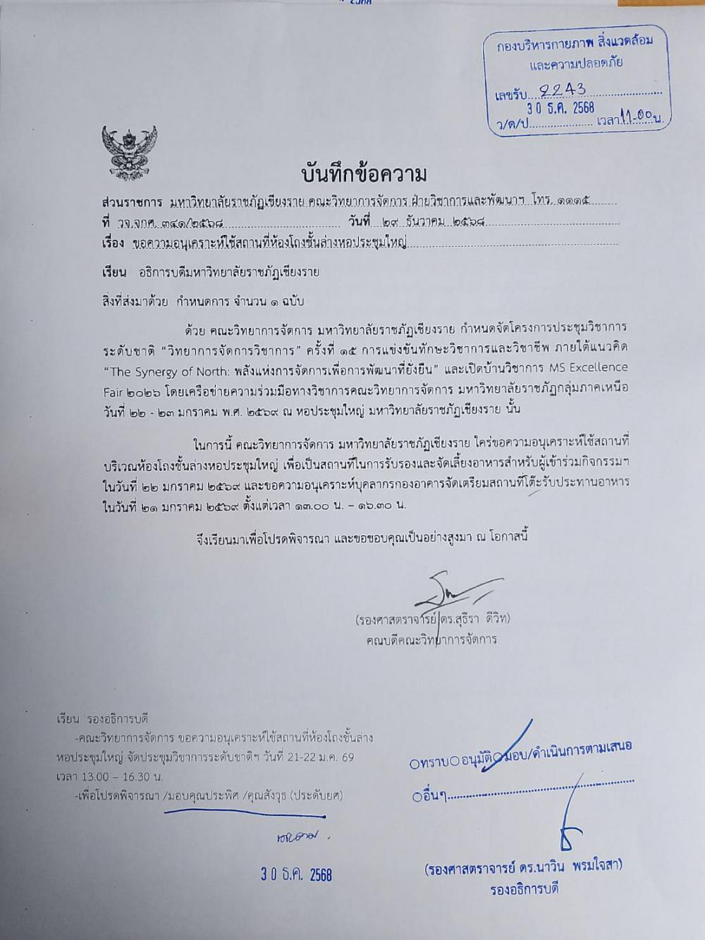 คณะวิทยาการจัดการ จัดสถานที่หอประชุมใหญ่ กิจกรรมประชุมวิชาการระดับชาติ ครั้งที่ 15 คณะวิทยาการจัดการ มหาวิทยาลัยราชภัฏกลุ่มภาคเหนือ วันที่ 21 ม.ค. 2569