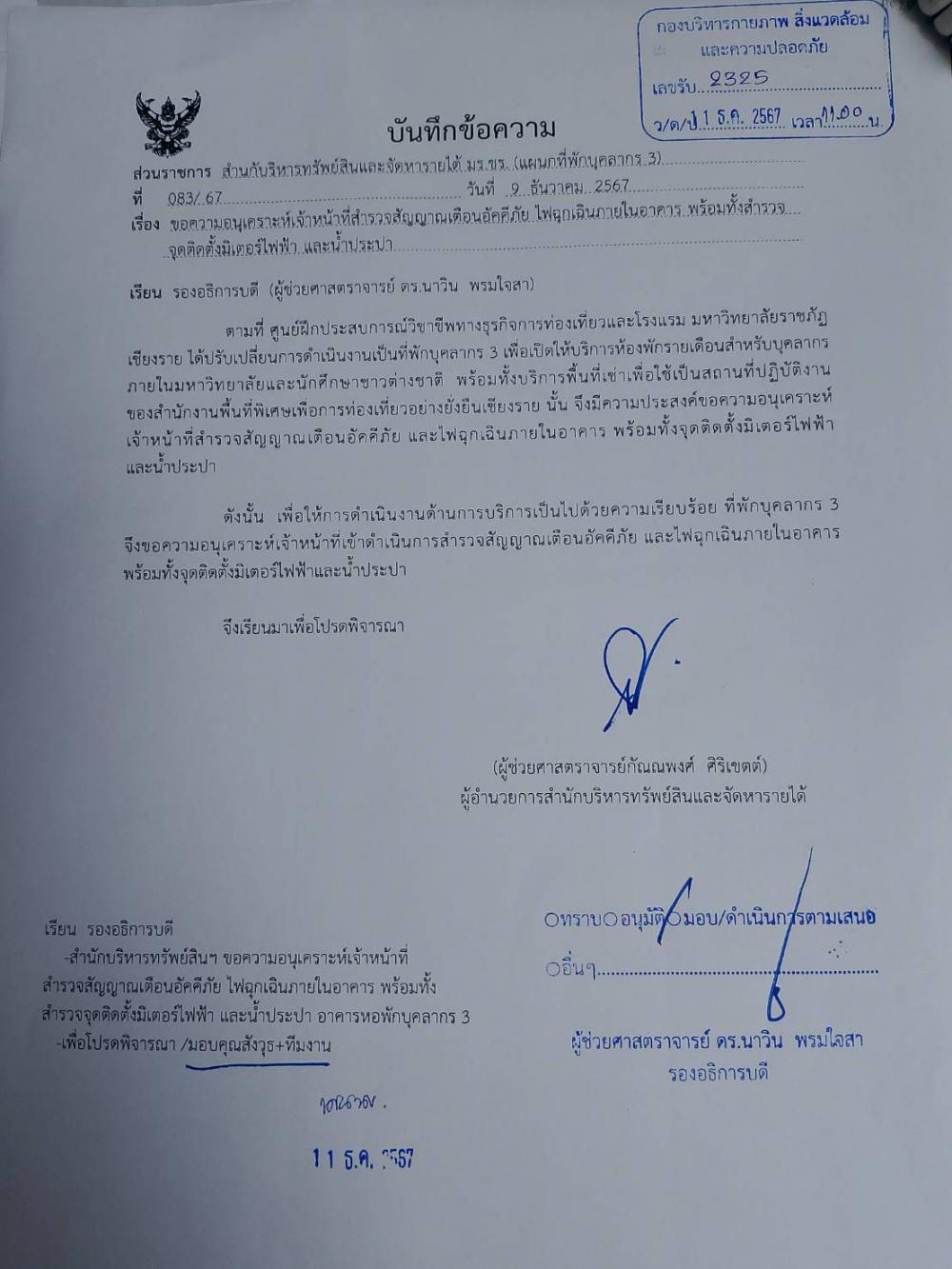 สำนักบริหารทรัพย์สินฯ สำรวจ ตรวจสอบและซ่อมแซม สัญญาณเตือนอัคคีภัย และไฟฉุกเฉินภายในอาคารที่พักบุคลากร 3 (ราชภัฏอินน์เดิม) พร้อมทั้งจุดติดตั้งมิเตอร์ไฟฟ้าและน้ำประปา