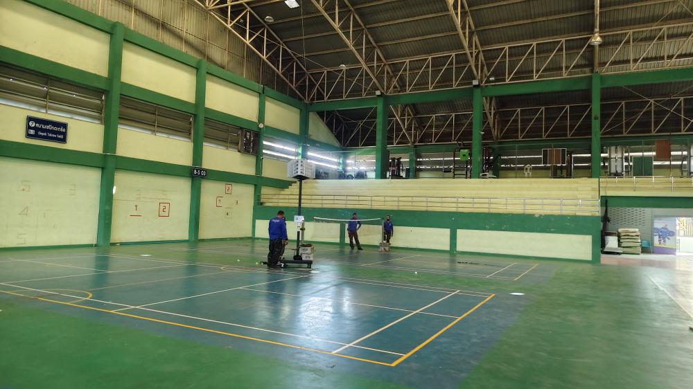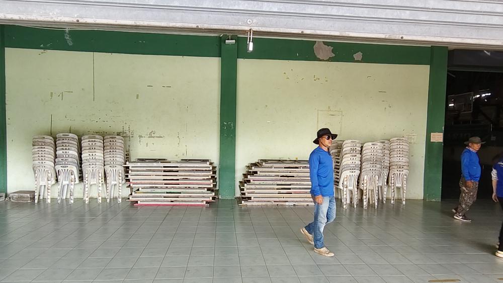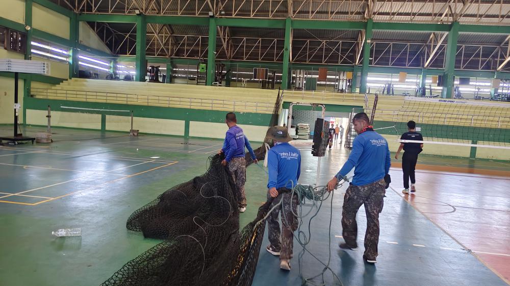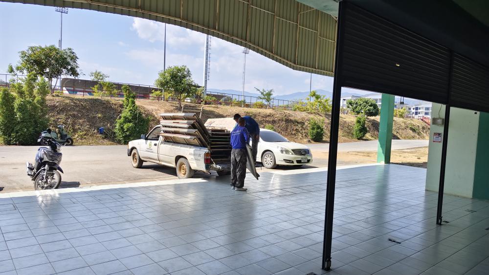 กองบริหารกายภาพฯ ขนโต๊ะเก้าอี้และปลดตาข่ายกั้นสนามเตรียมงานกีฬาสีบุคลากร