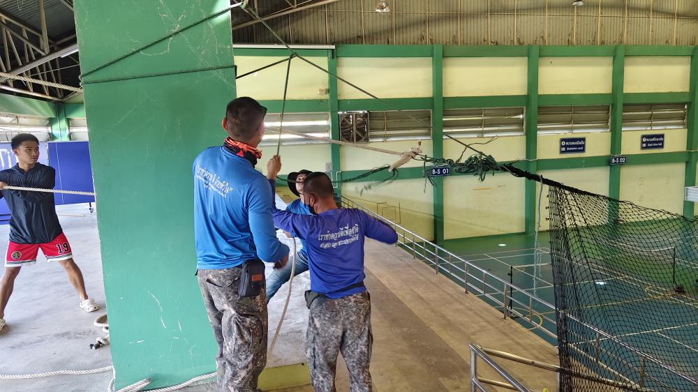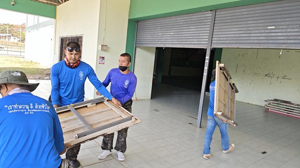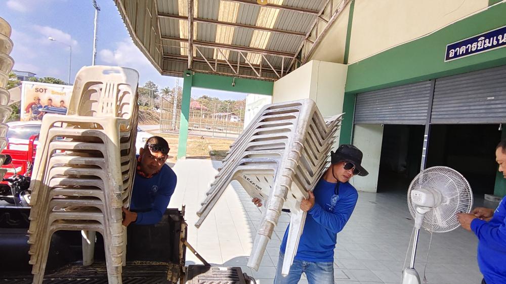 ขนโต๊ะเก้าอี้และปลดเก็บตาข่ายกั้นสนามเตรียมงานกีฬาสีบุคลากร