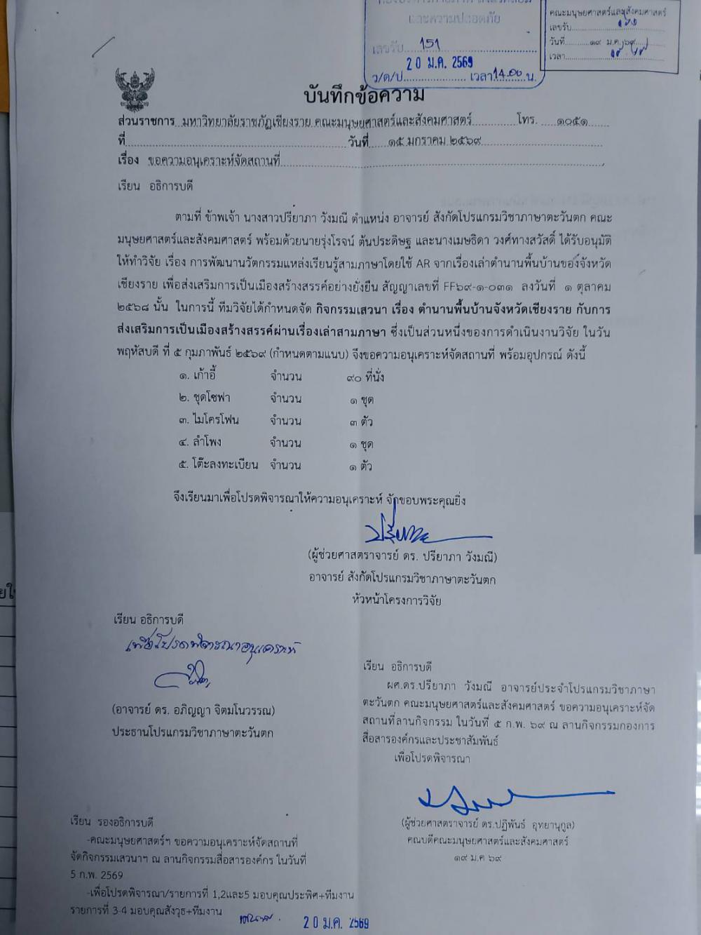 คณะมนุษยศาสตร์ฯ จัดสถานที่ กิจกรรมเสวนา เรื่องตำนานพื้นบ้านจังหวัดเชียงราย ฯ ณ ลานกิจกรรมสื่อสารองค์กร วันที่ 5 ก.พ. 2569